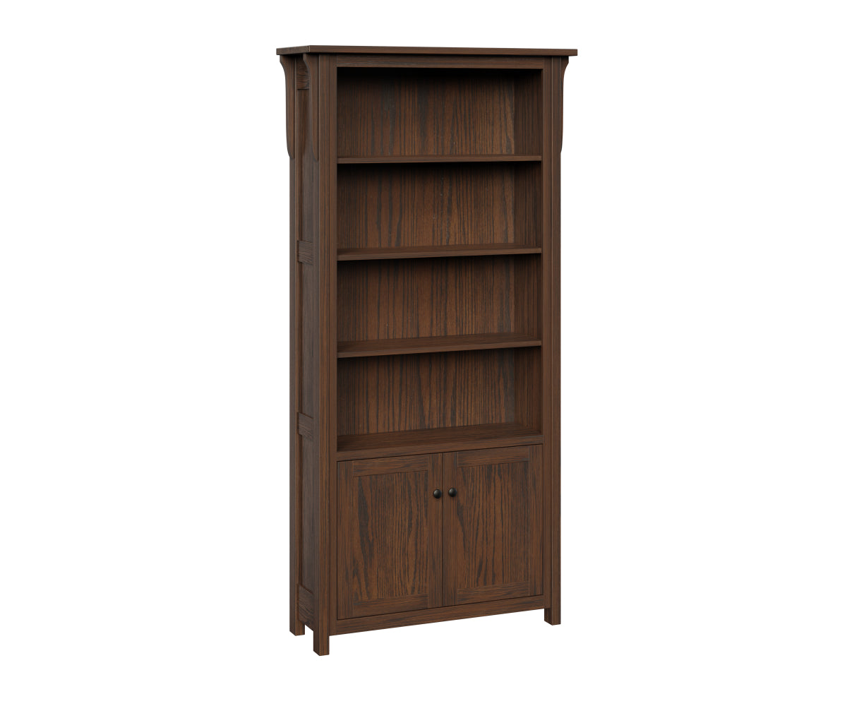 This Frank Lloyd Wright inspired Arts and Craft style bookcase is the perfect accent piece for a home office or living room. The doors on the bottom half are the perfect opportunity to keep your items out of sight and out of mind, while the open shelves on the top are an elegant display area.