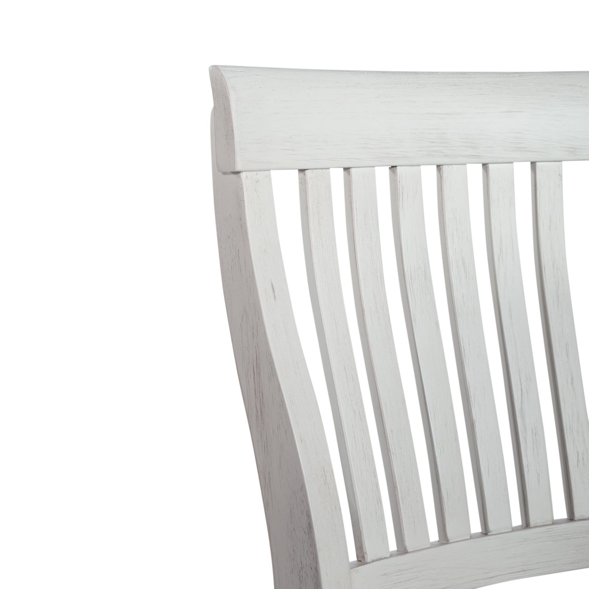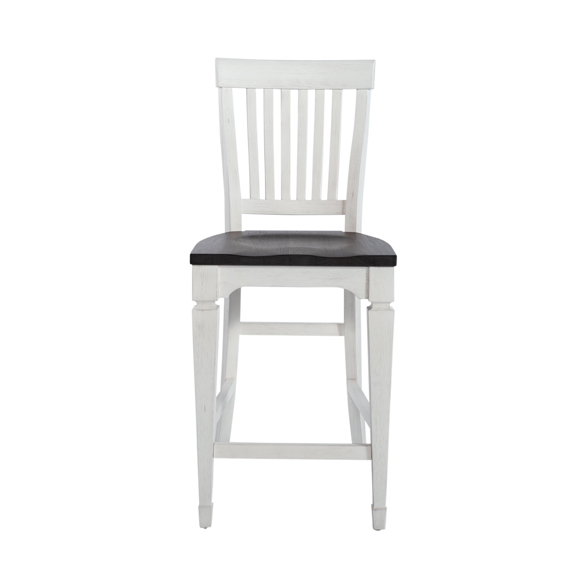 Sit in comfort and style with the Allyson Park counter height slat back chair. Crafted of poplar and rubberwood solids, this piece features a wire brushed white finish with a charcoal seat, curved wooden seat for added comfort, a slat back, nylon chair glides to protect your flooring, and is anchored by square tapered legs. This chair is perfect for creating a classic look while maintaining a casual feel.
