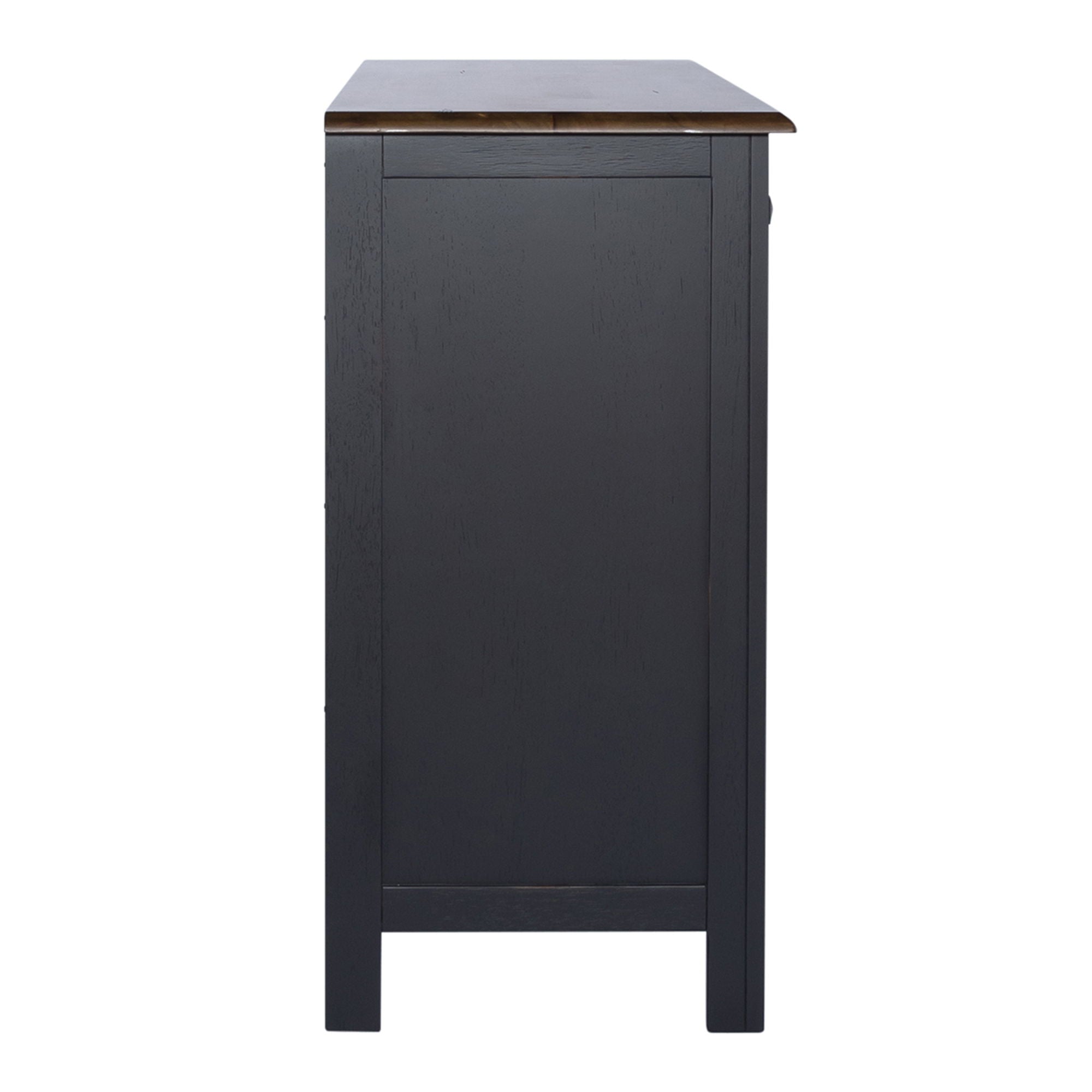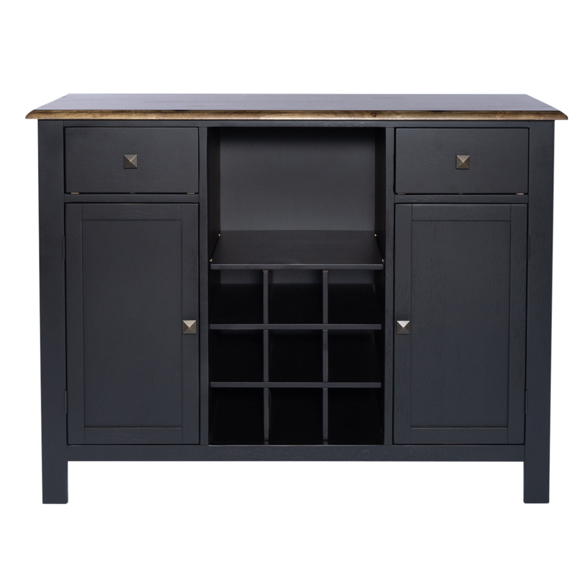 Enhance your space with the Carolina Crossing server in black. Crafted of rubberwood solids, this piece features a two-toned black and honey finish, bottom case dust proofing, two fully stained interior drawers, removeable nine bottle wine storage, two wood framed doors with one adjustable shelf behind each, and is accented by antique brass square knob hardware. This server is available in multiple finishes and the heavy distressing translates well into any decor.