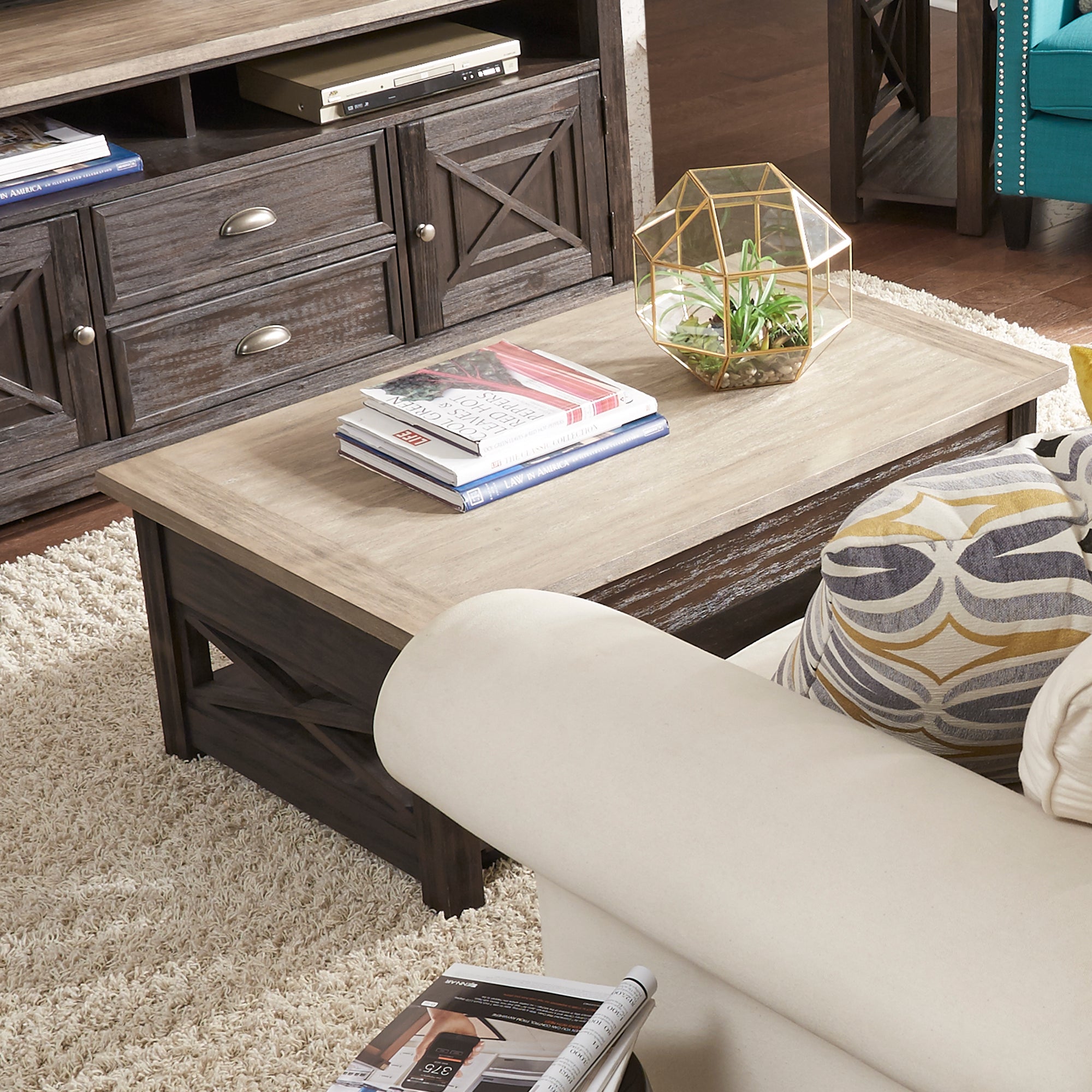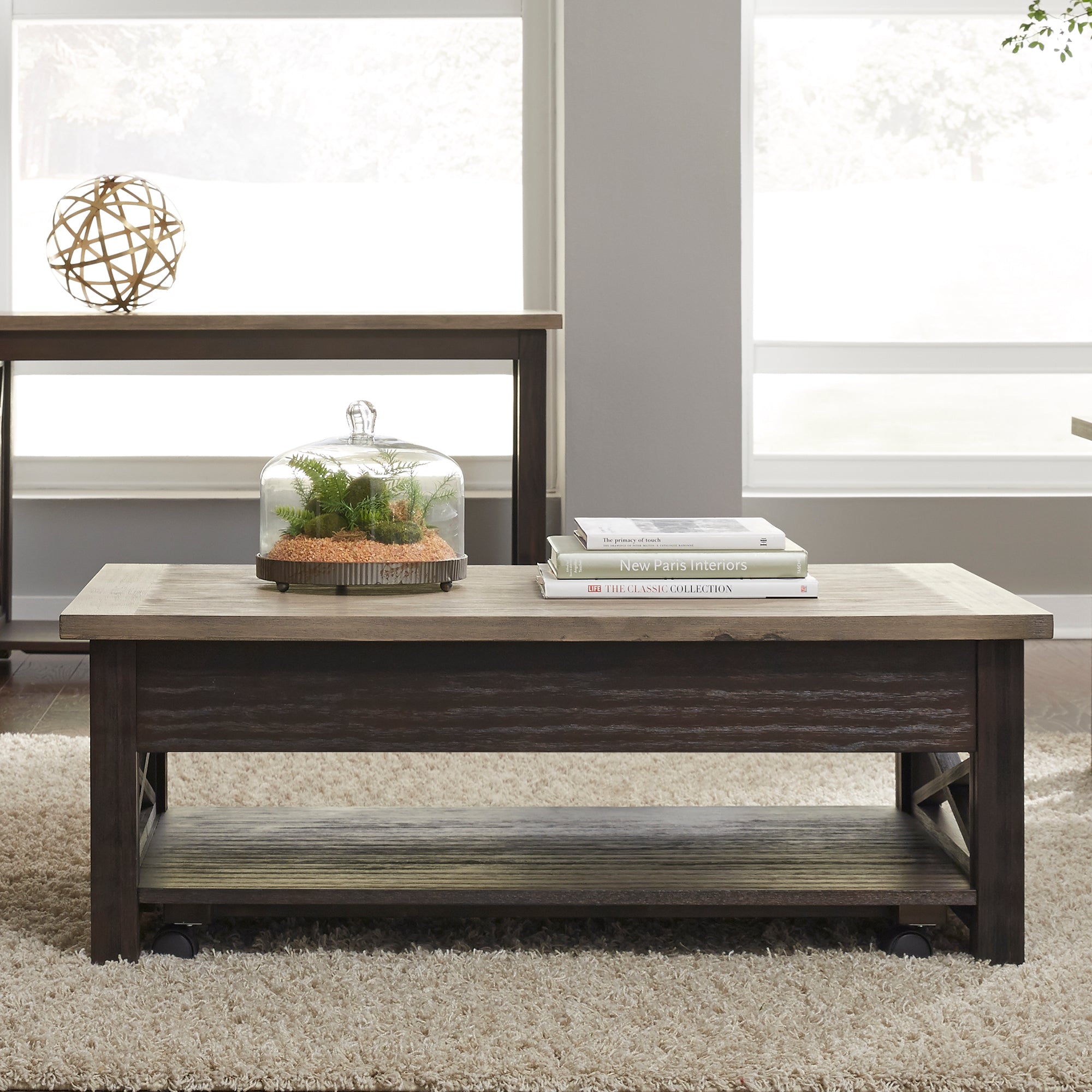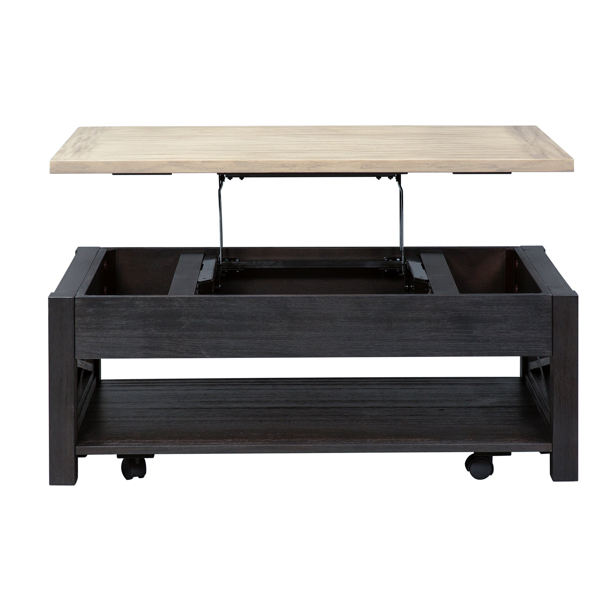 Transform your space with the Heatherbrook lift top cocktail table. Crafted of poplar solids and acacia veneers, this piece features a charcoal and ash finish, a top with the ability to extend to a height of 27”, bottom shelf for additional storage, appealing open grid end panels, casters for easy moveability, anchored by a block leg design. This one of a kind lift top cocktail table would be a wonderful accent piece in any home.