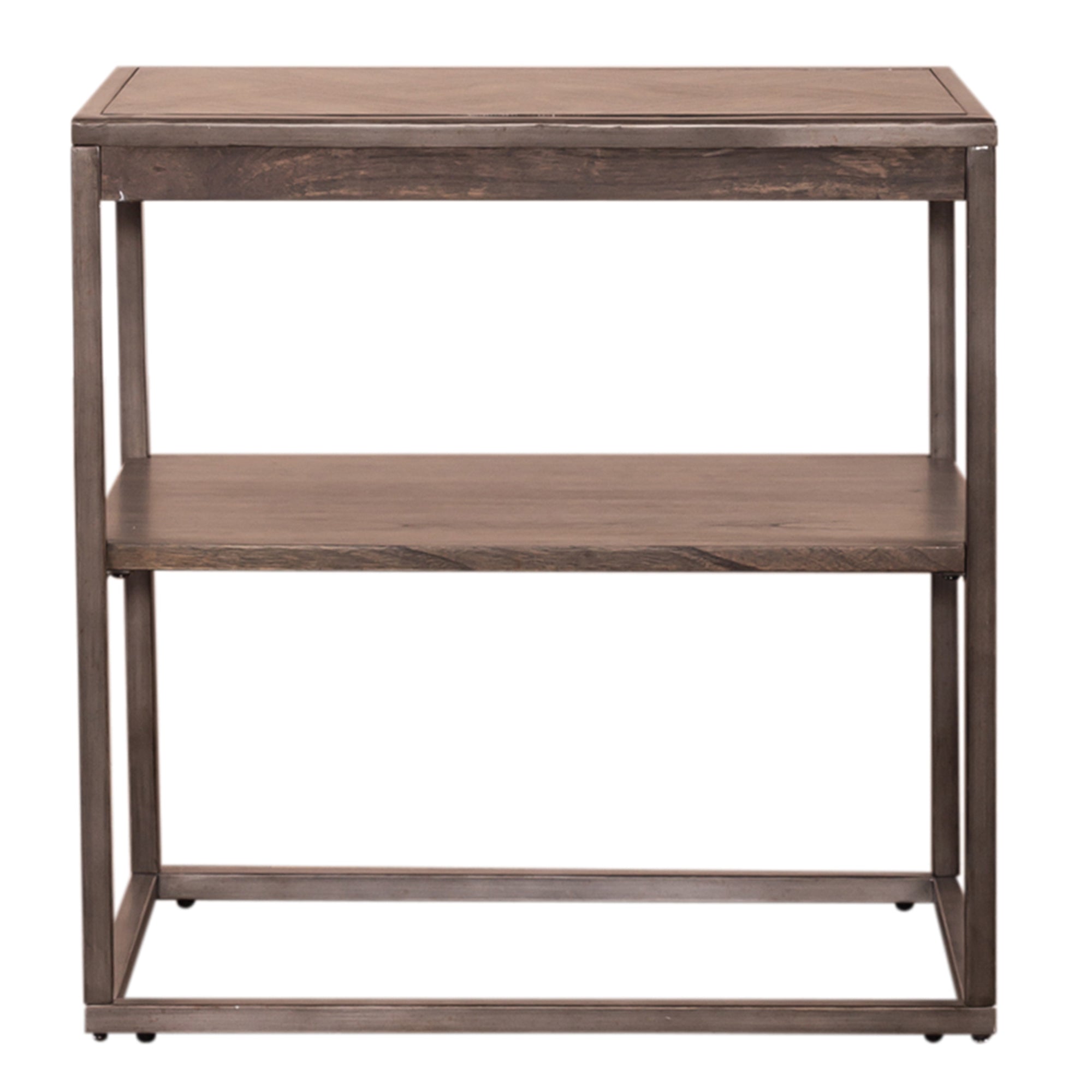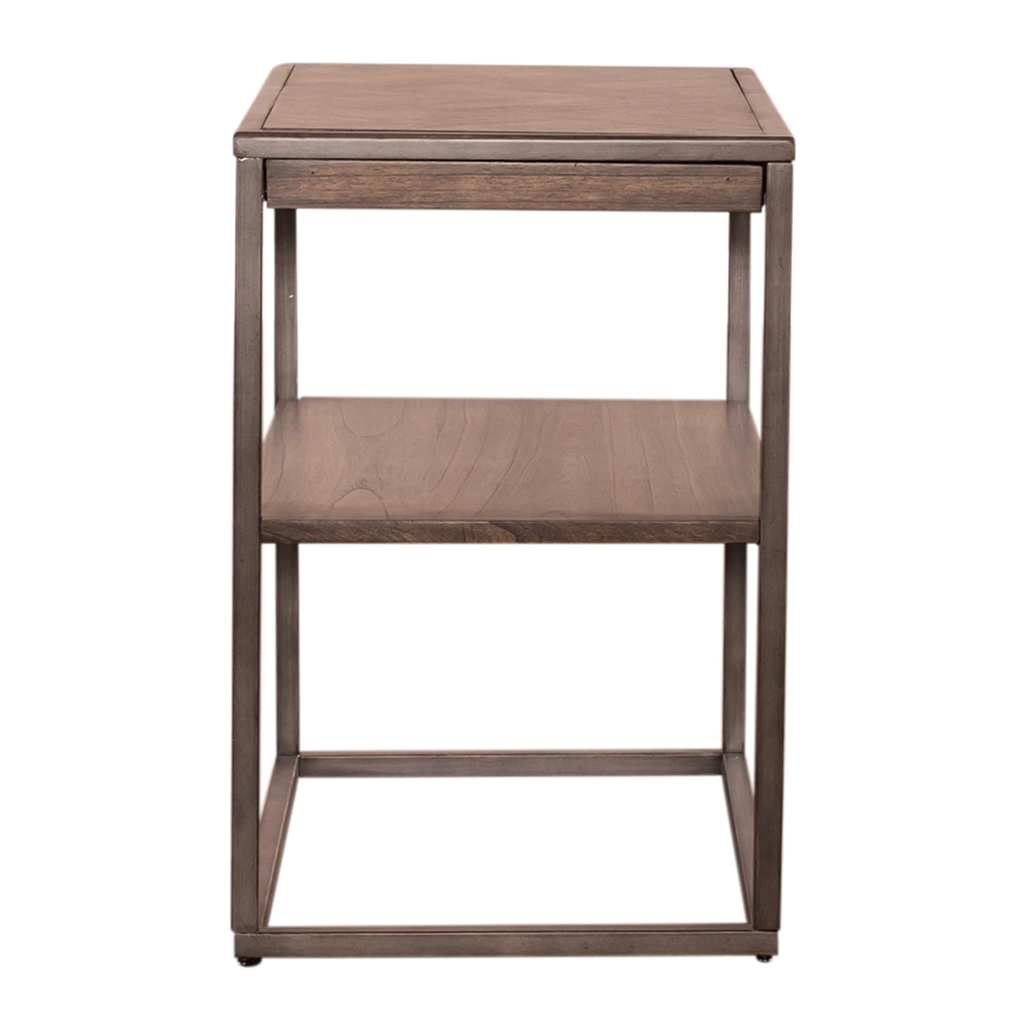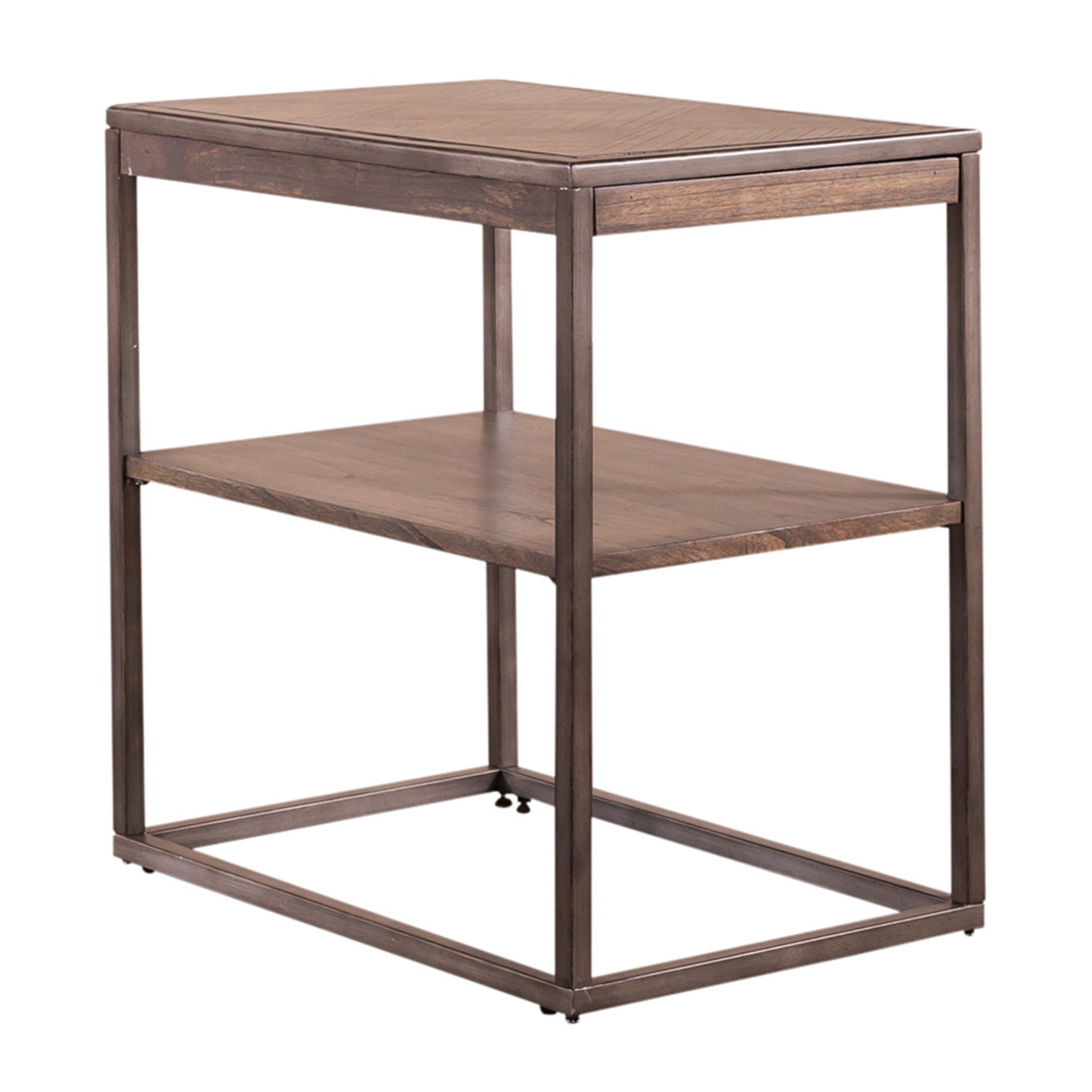Simplify your urban space with the Jamestown chair side table. Crafted of rubberwood solids, metal tubes and mindy veneers, this piece features a tobacco finish, a diamond match veneer pattern, a lower level shelf for additional storage, and an appealing pull out tray perfect for placing your drinks. This modern side table would make a great addition to your contemporary feeling space.