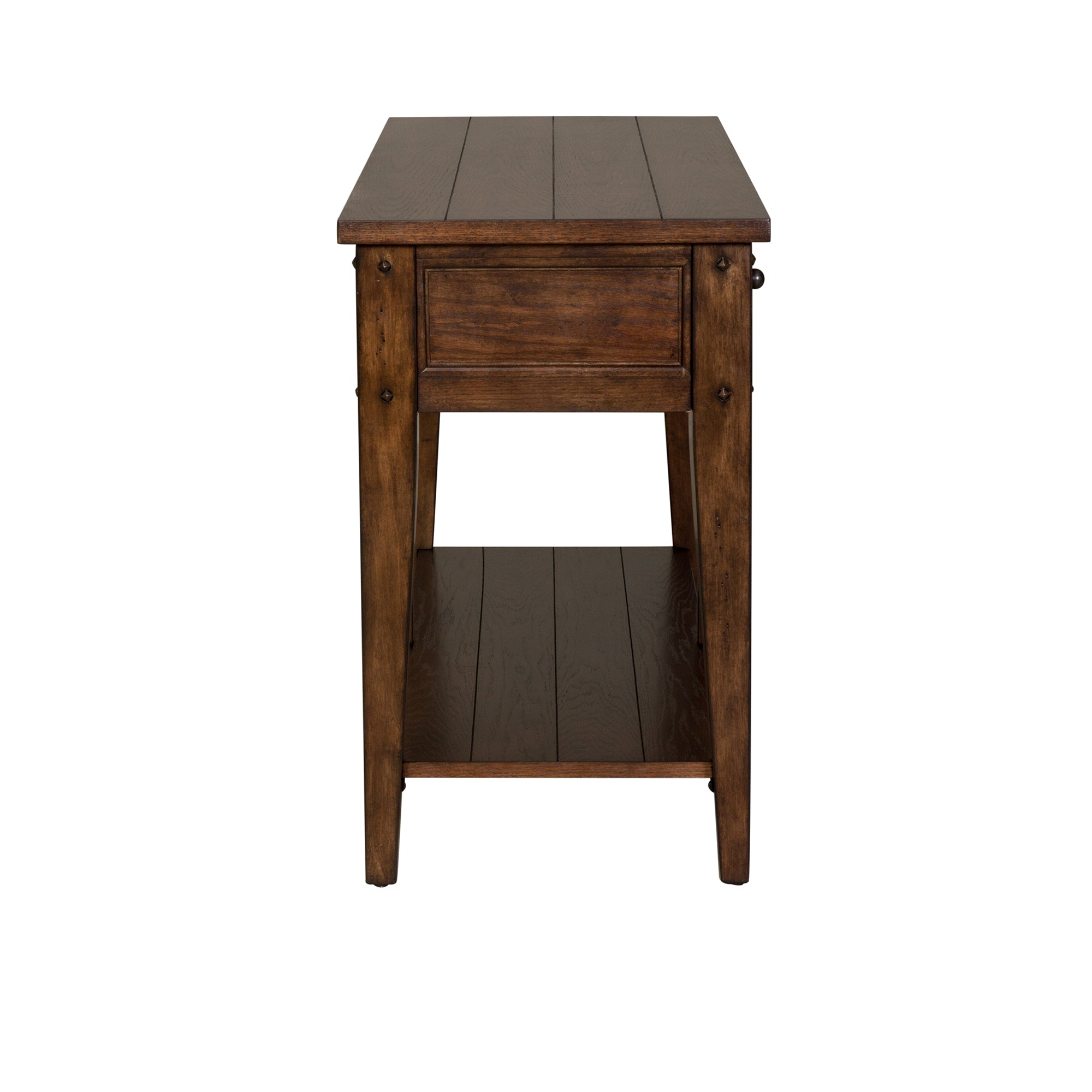 Accent your space with the casual country style Lake House sofa table. Crafted of poplar solids and oak veneers, this piece features a rustic brown oak finish, appealing planked top, bottom planked shelf and two drawers for additional storage, simplistic wood and peg accents, antiqued brass knob hardware, anchored by a tapered leg design. The rustic oak finish allows for a universal appeal.