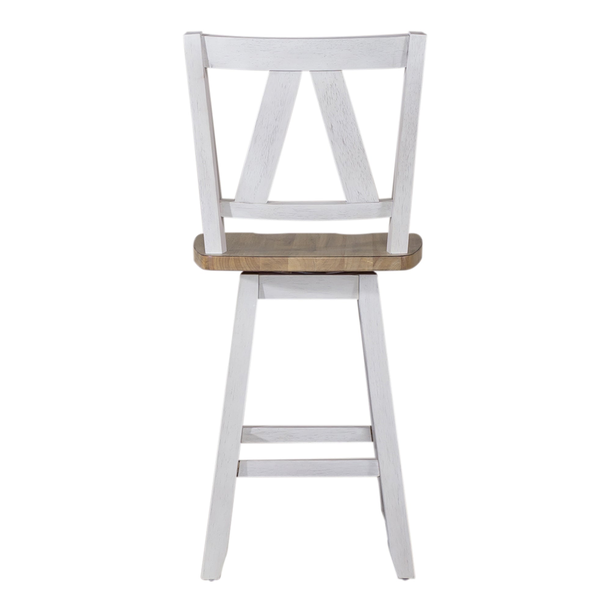 Sit in comfort and style with the Lindsey Farm counter height swivel chair. Crafted of rubberwood solids, this piece features a weathered white and sandstone finish, inverted v design on the chair back, nylon chair glides to protect your flooring, and a swivel saddle shaped seat for added comfort. This piece has an alternate finish and offers a look that compliments today's homes with style uncompromised and comfort abound.