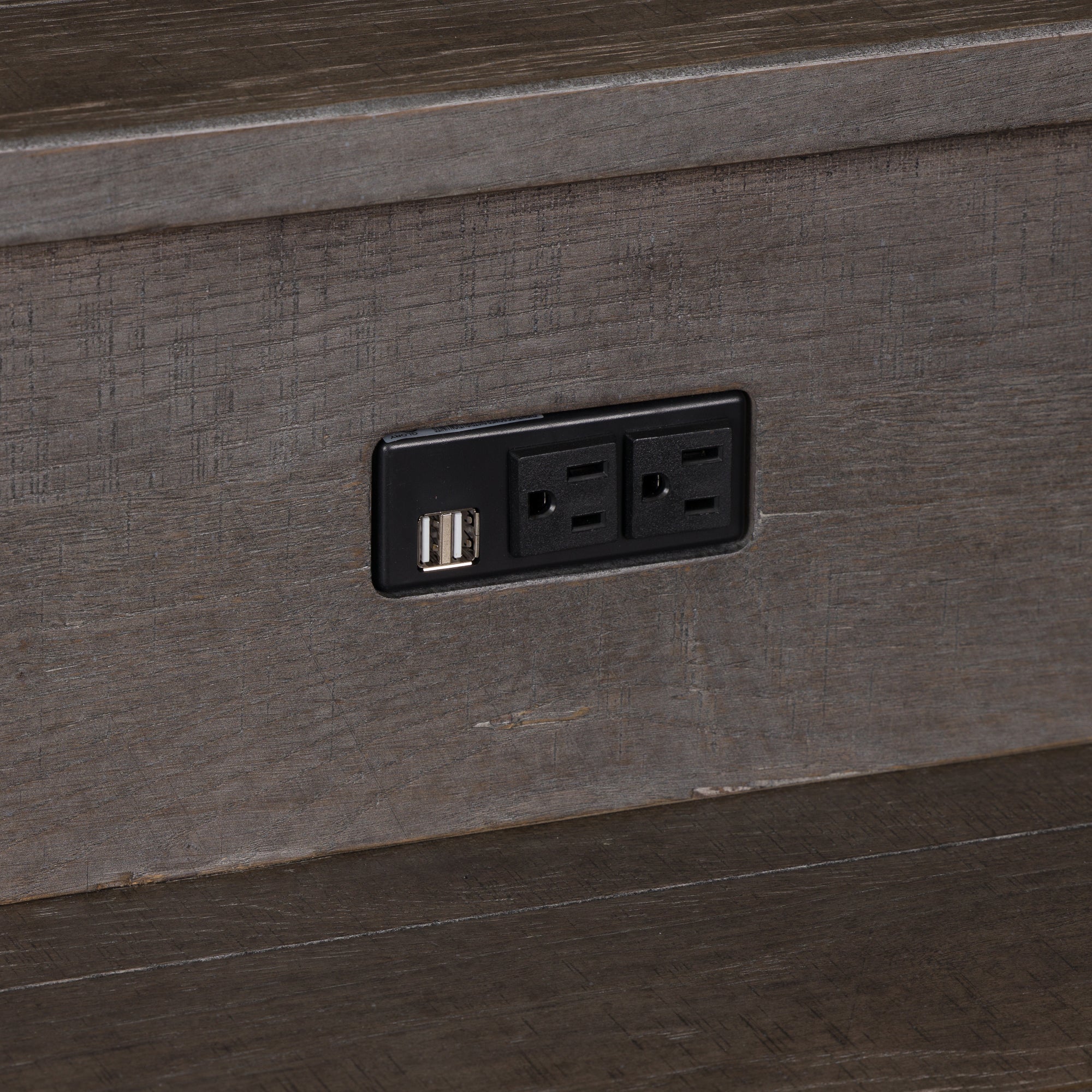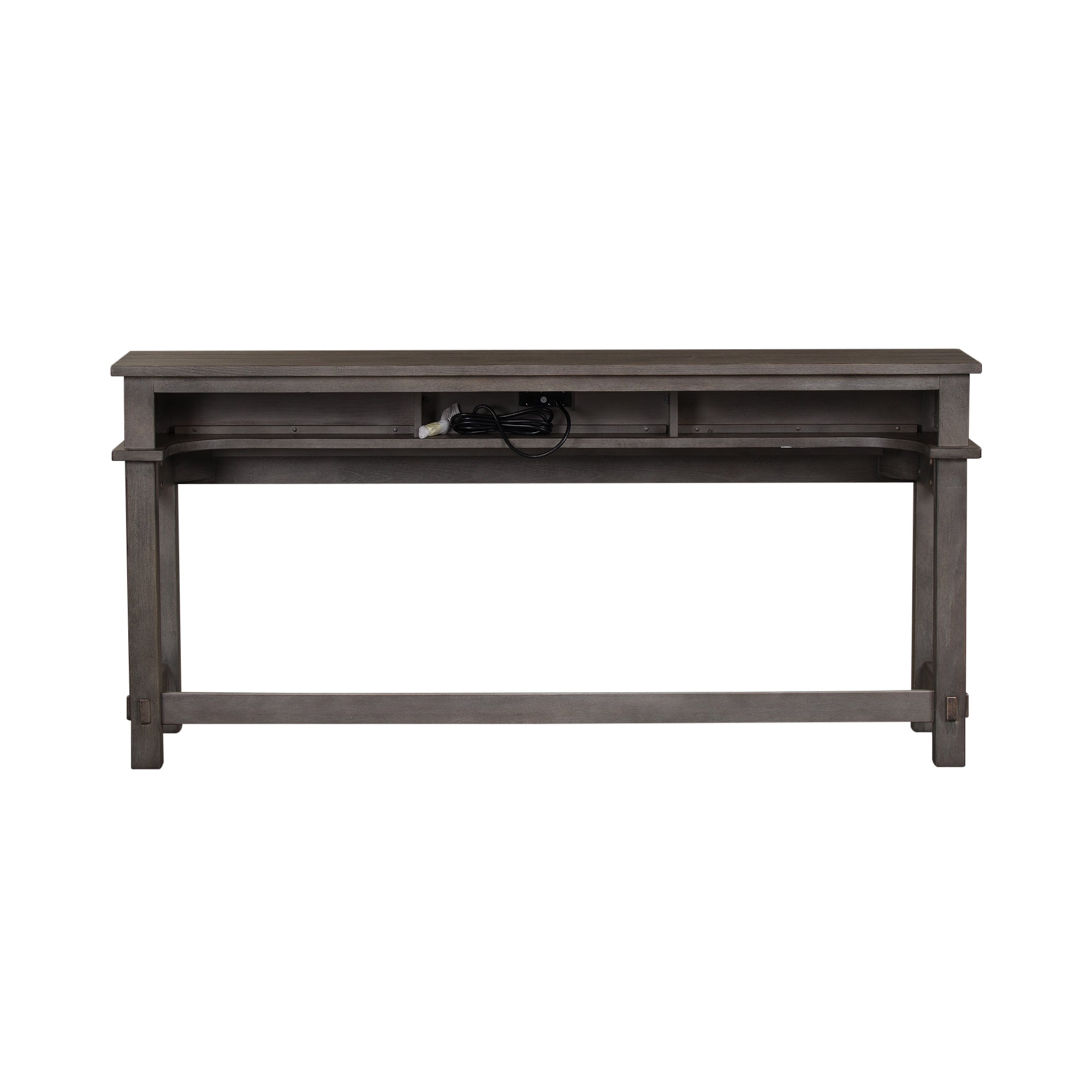 Elevate your space with the Modern Farmhouse console bar table. Crafted of poplar solids with knotty white oak veneers, this piece features a dusty charcoal finish with heavy distressing, appealing high-low planked top, two plug receptacles and USB ports for easy access charging, with room to comfortability fit three barstools. Also available in an alternate finish, this modern farmhouse piece would be a great addition to your cottage or contemporary style space, especially behind your sofa.