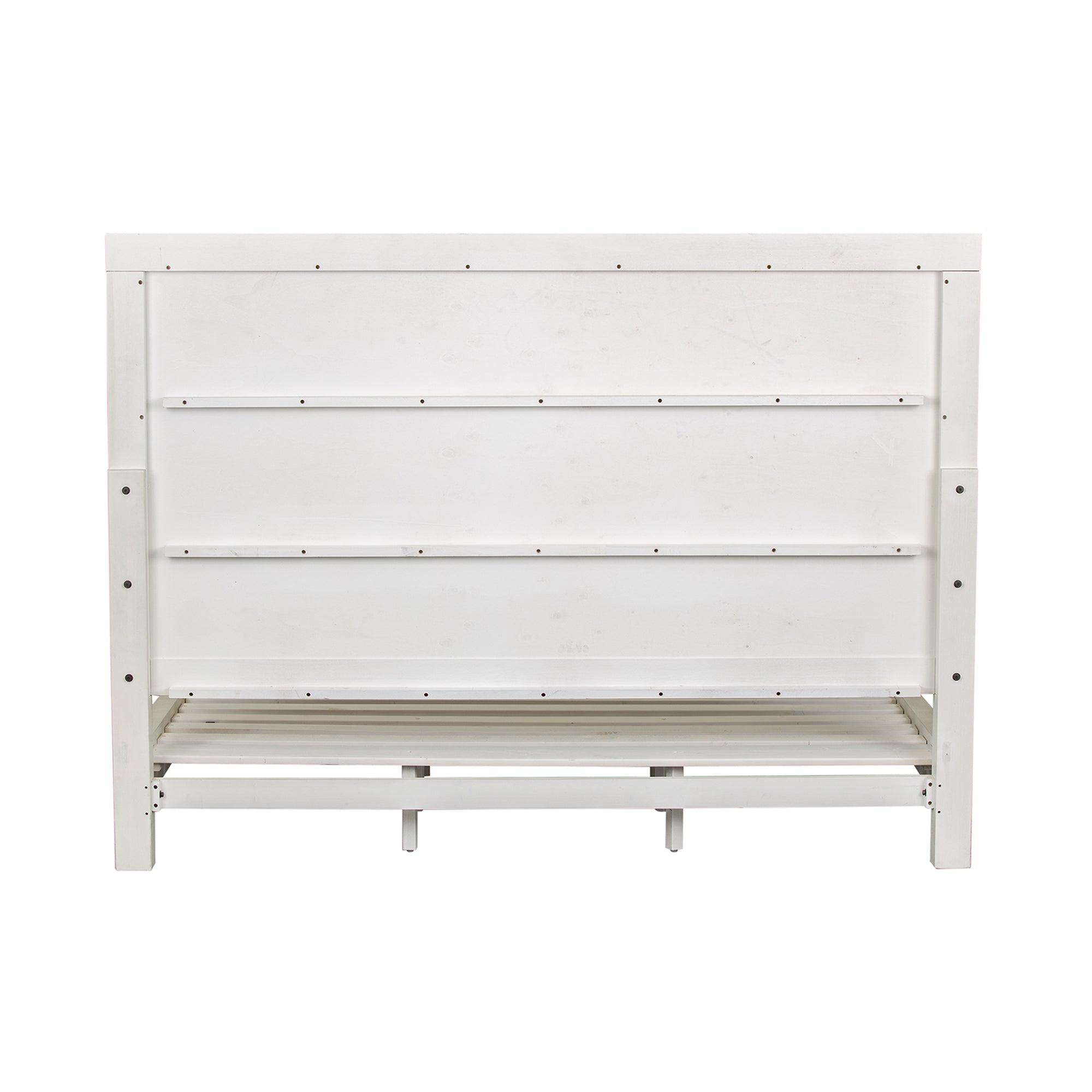Accent your bedroom with the perfect farmhouse design, using this unique and stylish platform bed. Crafted with rubberwood solids and knotty white oak veneers, this piece features bolt on rails, a platform footboard, and a geometric pattern. This bed does not require a box spring, allowing for a true platform feel. The all-over flea market white finish accompanied by heavy distressing sets this piece apart from the rest of the collections.