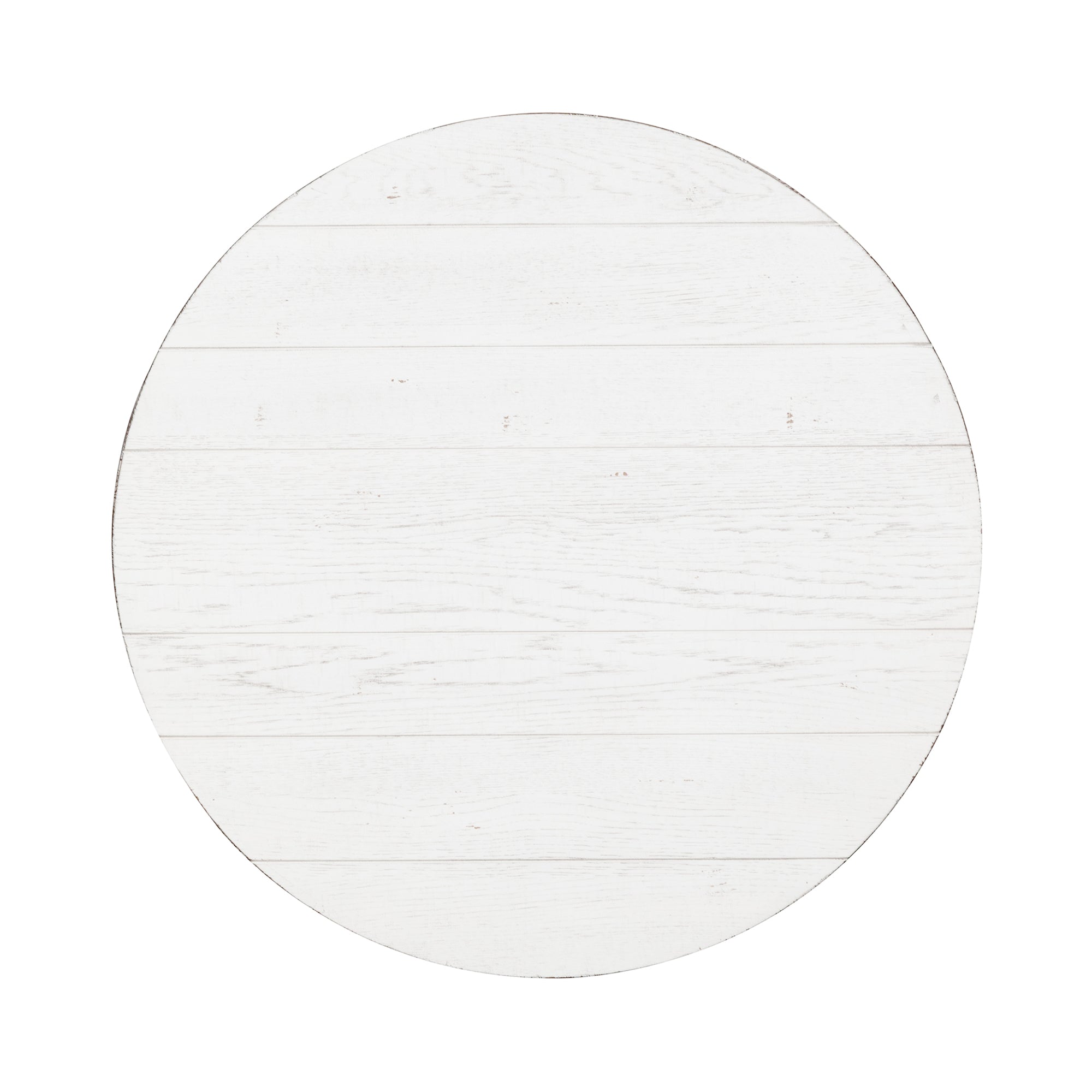 Accent your space with the Modern Farmhouse splay leg round cocktail table. Crafted of poplar solids with knotty white oak veneers, this piece features a dusty flea market white finish with heavy distressing, appealing high-low planked top, anchored by a splayed leg design. Also available in an alternate finish, this modern farmhouse piece would be a wonderful addition to your cottage or contemporary style space.