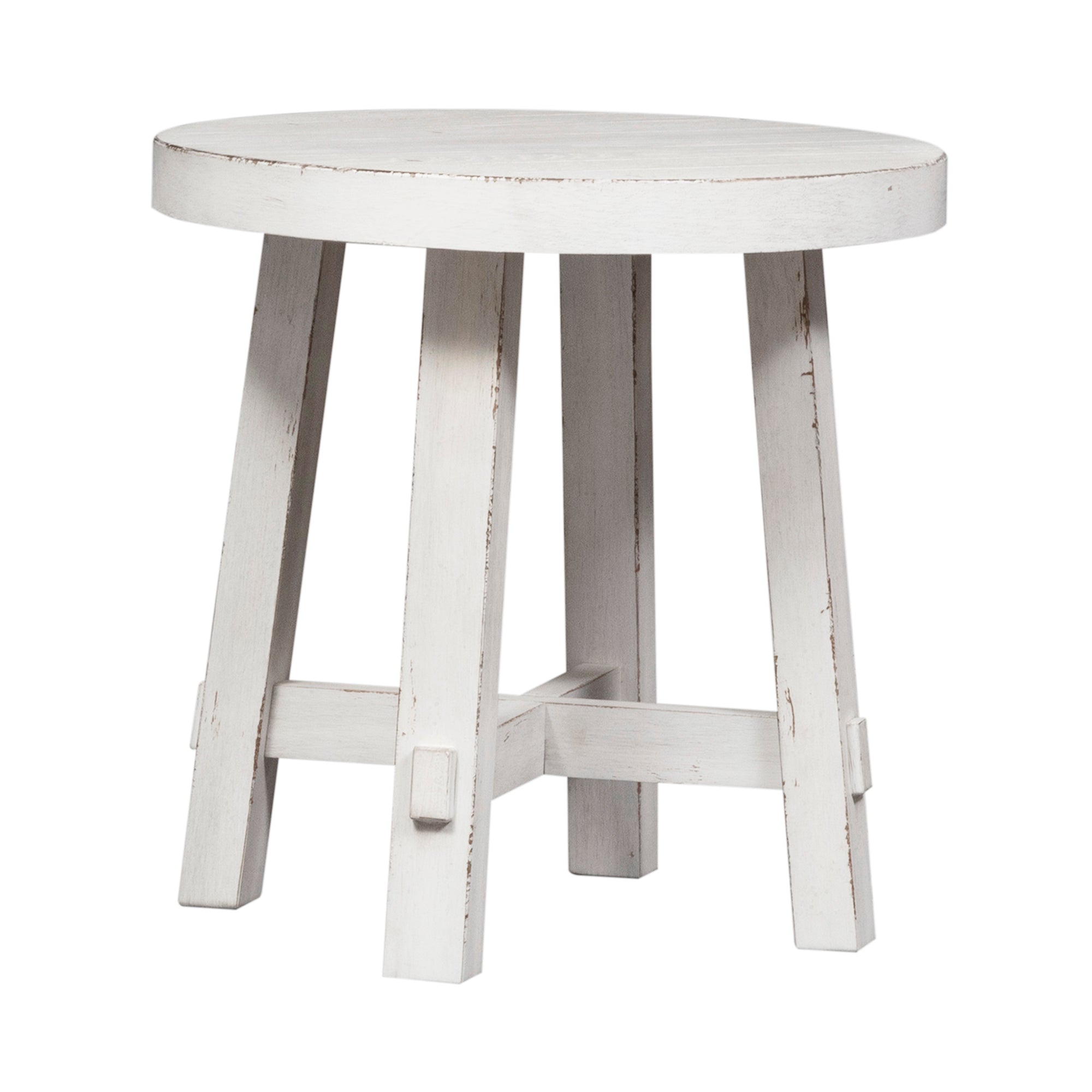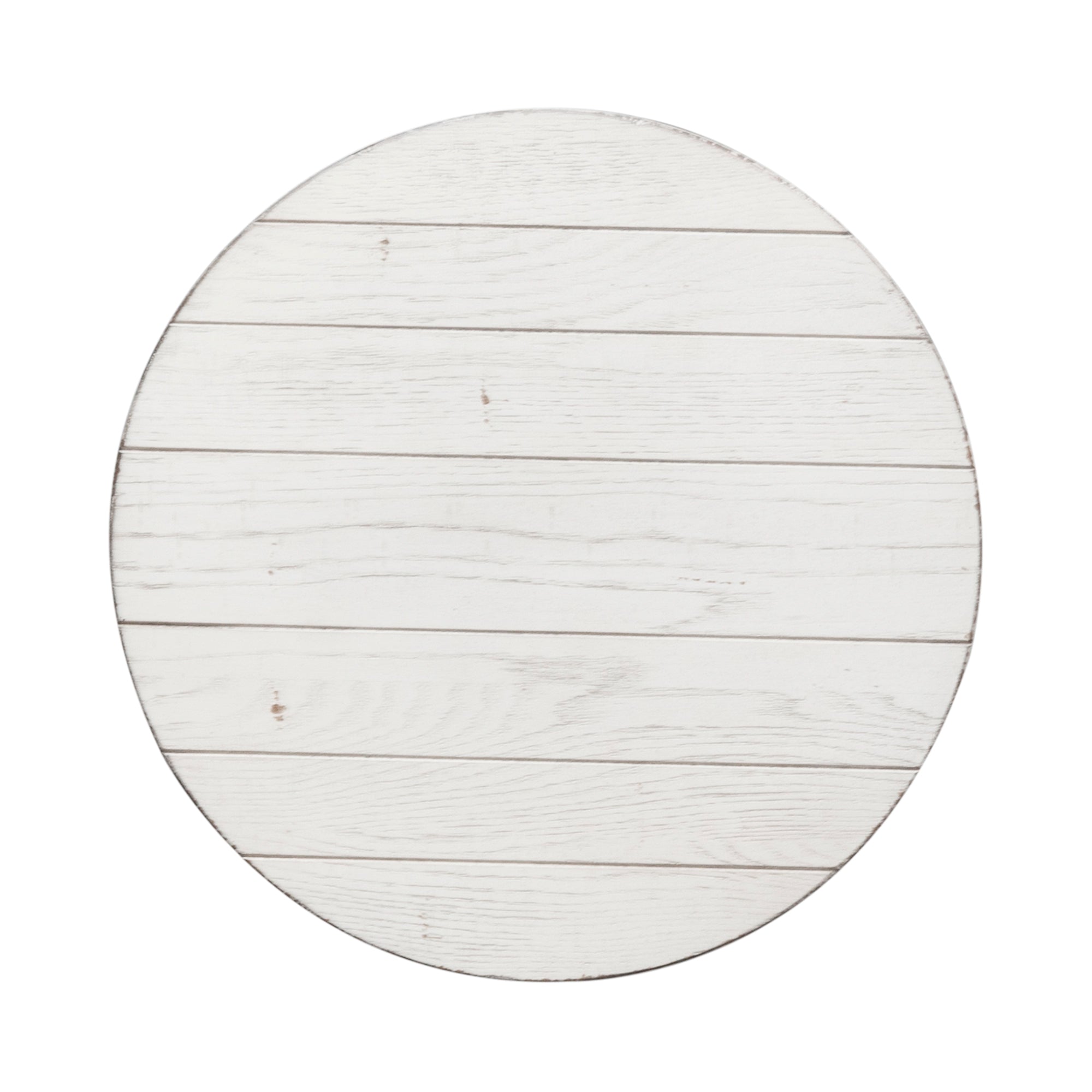Enhance your space with the Modern Farmhouse splayed leg round end table. Crafted of poplar solids with knotty white oak veneers, this piece features a flea market white finish with heavy distressing, appealing high-low planked top, anchored by a splayed leg design. Also available in an alternate finish, this modern farmhouse piece would be a great addition to your cottage or contemporary style space.