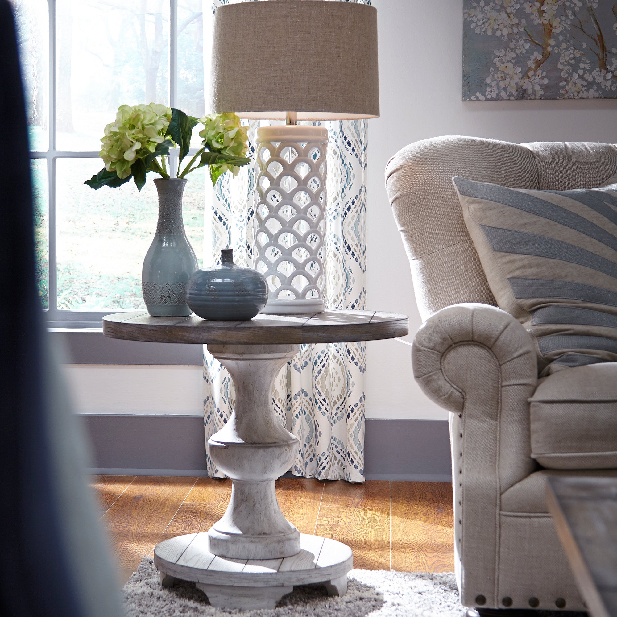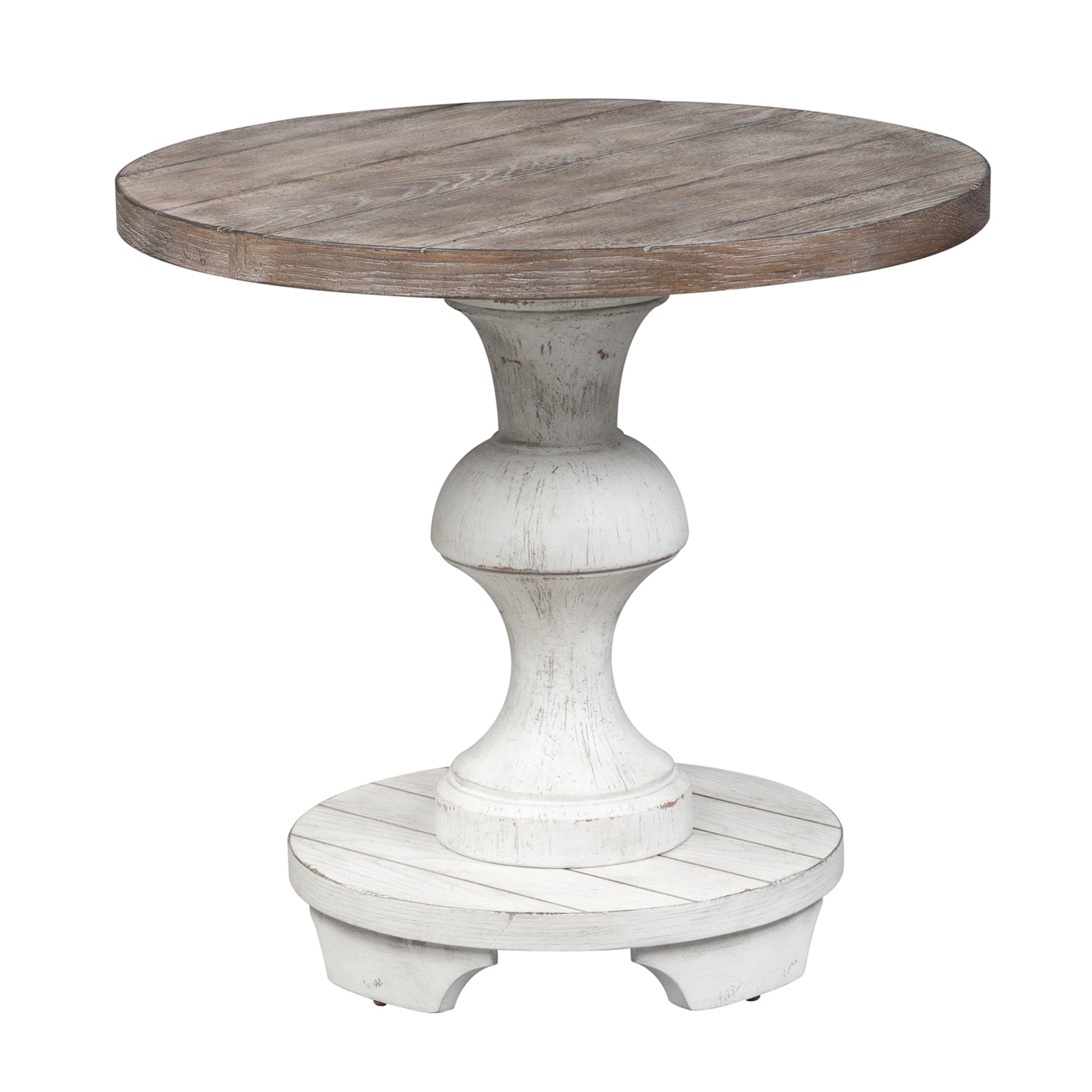 Accent your space with the Spanish style Sedona end table. Crafted of rubberwood solids and white oak veneers, this piece features a heavy distressed white finish and gravel top, appealing planked top, anchored by a Spanish style round turned pedestal base. Also available in an alternate finish, this gorgeous end table will be a great addition to any traditional style space.