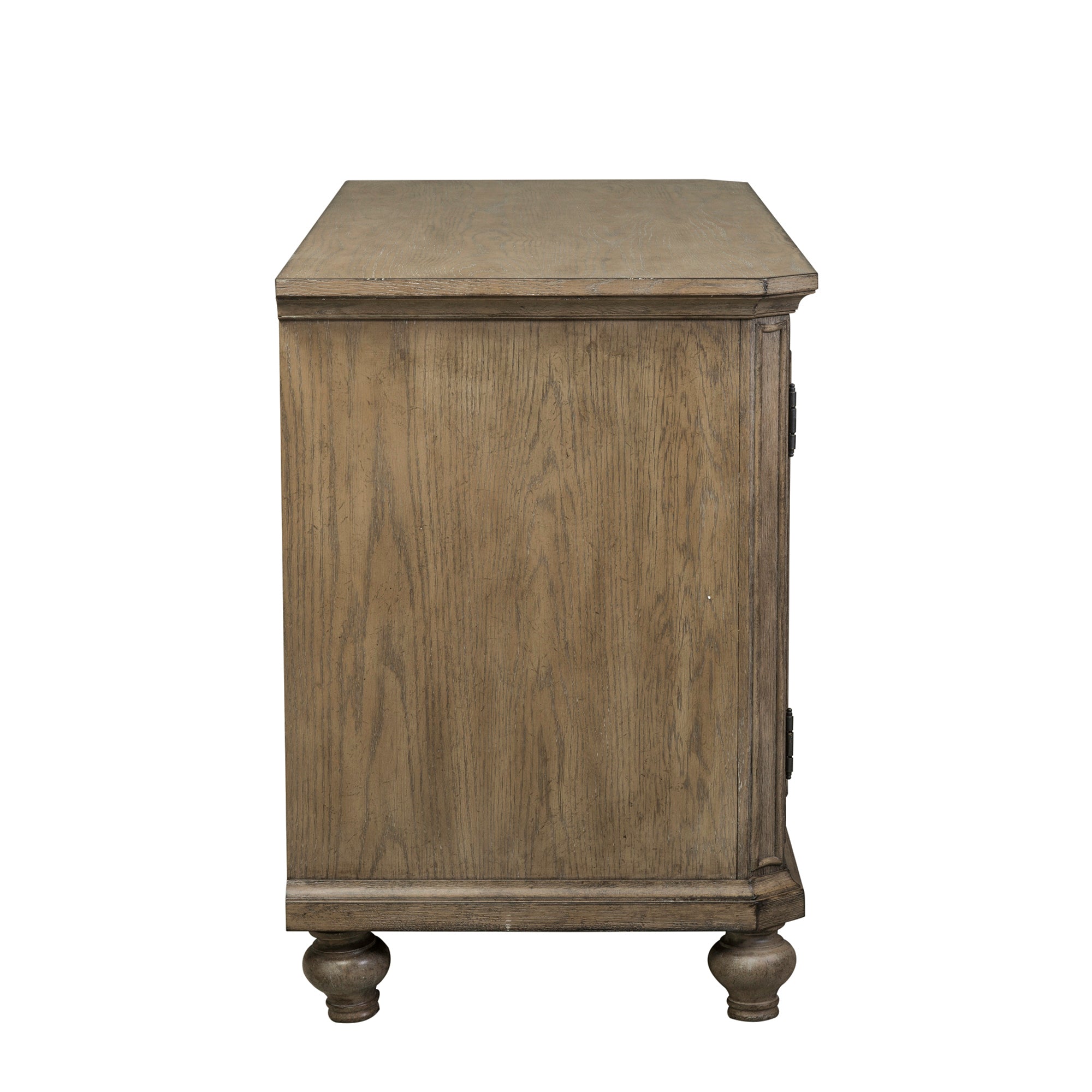 Invite a combination of casual styling and elegant ambiance into your space with the Simply Elegant credenza. Crafted with rubberwood solids and cathedral white oak veneers, this piece features fully stained full extension drawers, canted corners with bead molding, antique mirrored doors with a decorative grid overlay, adjustable shelves, and wood framed drawer fronts. The heathered taupe finish paired with the antique brass knob and drop ring pull hardware is sure to tie any space together.