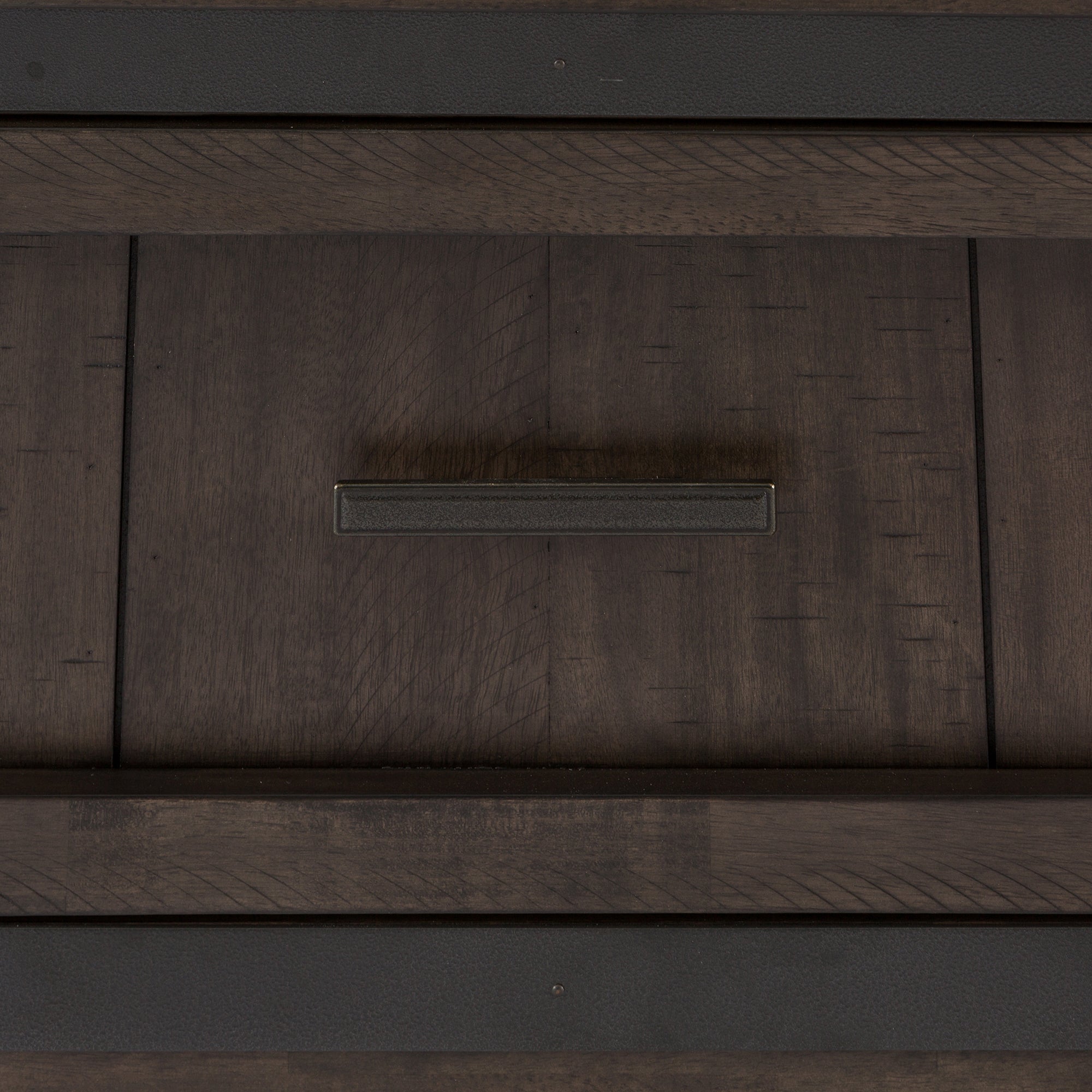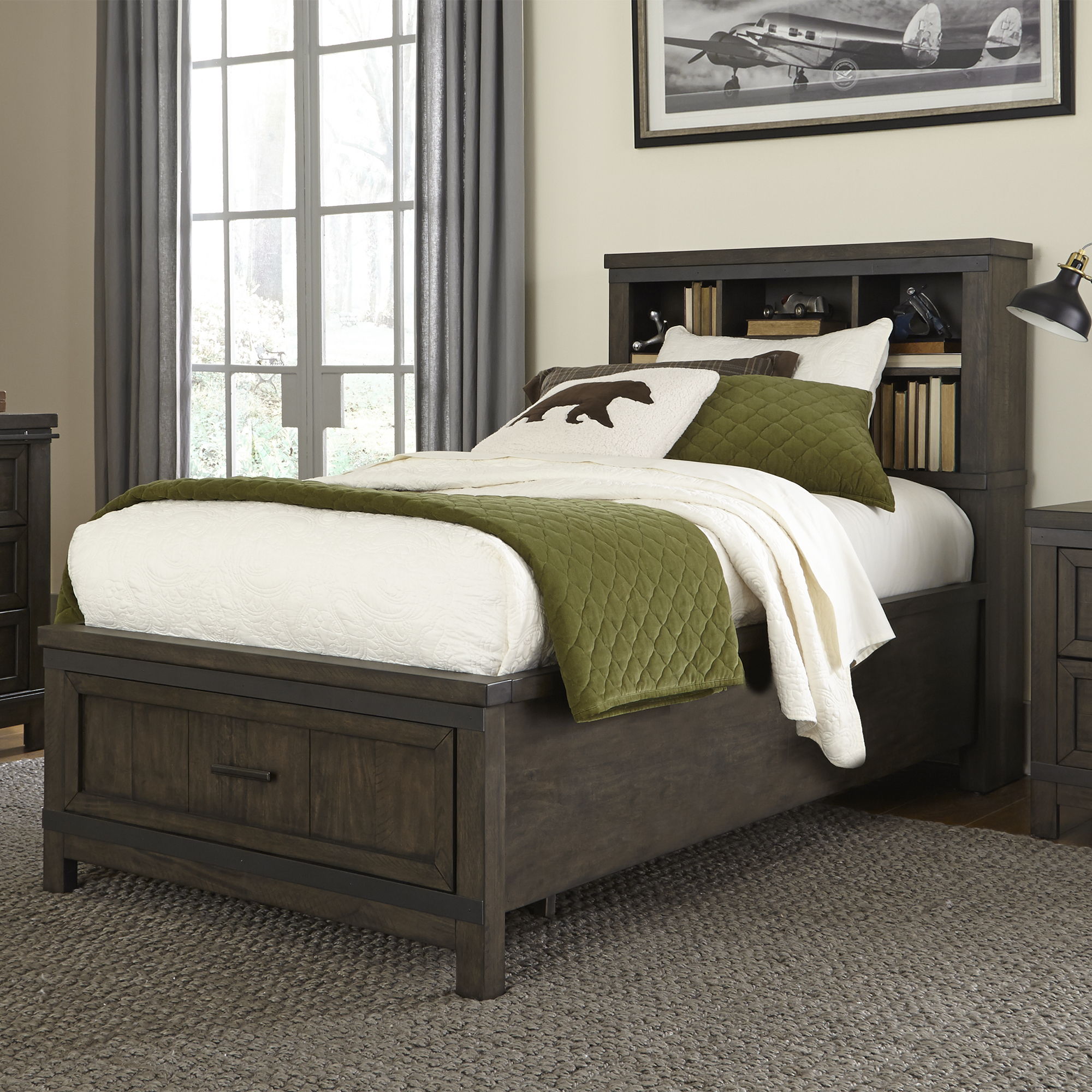 Add a natural feeling to your living space using the Thornwood Hills bookcase bed. Crafted with rubberwood solids and mango veneers, the rock beaten gray finish is highlighted by saw cuts and hammered metal strip accents across the bookcase headboard and storage footboard. The bookcase offers storage with four adjustable shelves, three separate wire management provisions, fully stained interior drawers on the footboard, full extension drawer glides for easy access to storage, and framed drawer fronts with hammered metal bar pull hardware in a dark antique pewter on the storage footboard. Never question the reliability of the bed due to the bolt-on rails and center supported slat system.