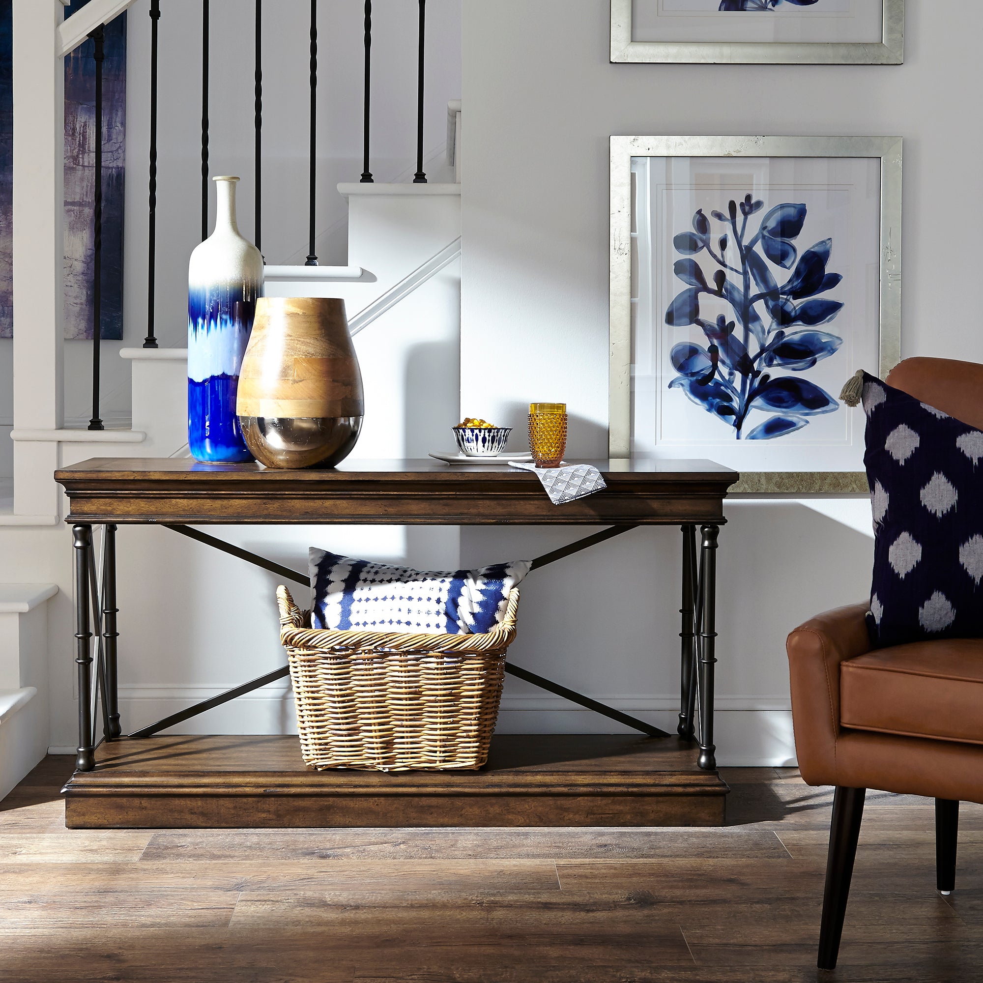 Elevate your space with the classic Tribeca sofa table. Crafted of poplar solids and birch veneers, this piece features a cordovian brown finish, a bottom shelf for storage, walnut inlay, X metal accents, anchored by turned legs with ring accents. A warm and inviting addition to any traditional style space.