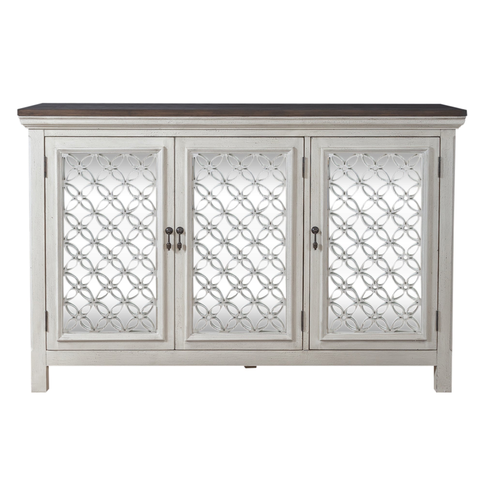 Transform your home with the Westridge 56" accent cabinet. Crafted of Eucalyptus solids and Ash veneers in an antique white finish. Features three mirrored doors with decorative floral pattern overlays, block feet and one concealed fixed shelf behind doors. A unique piece that will work with any décor from traditional to contemporary.