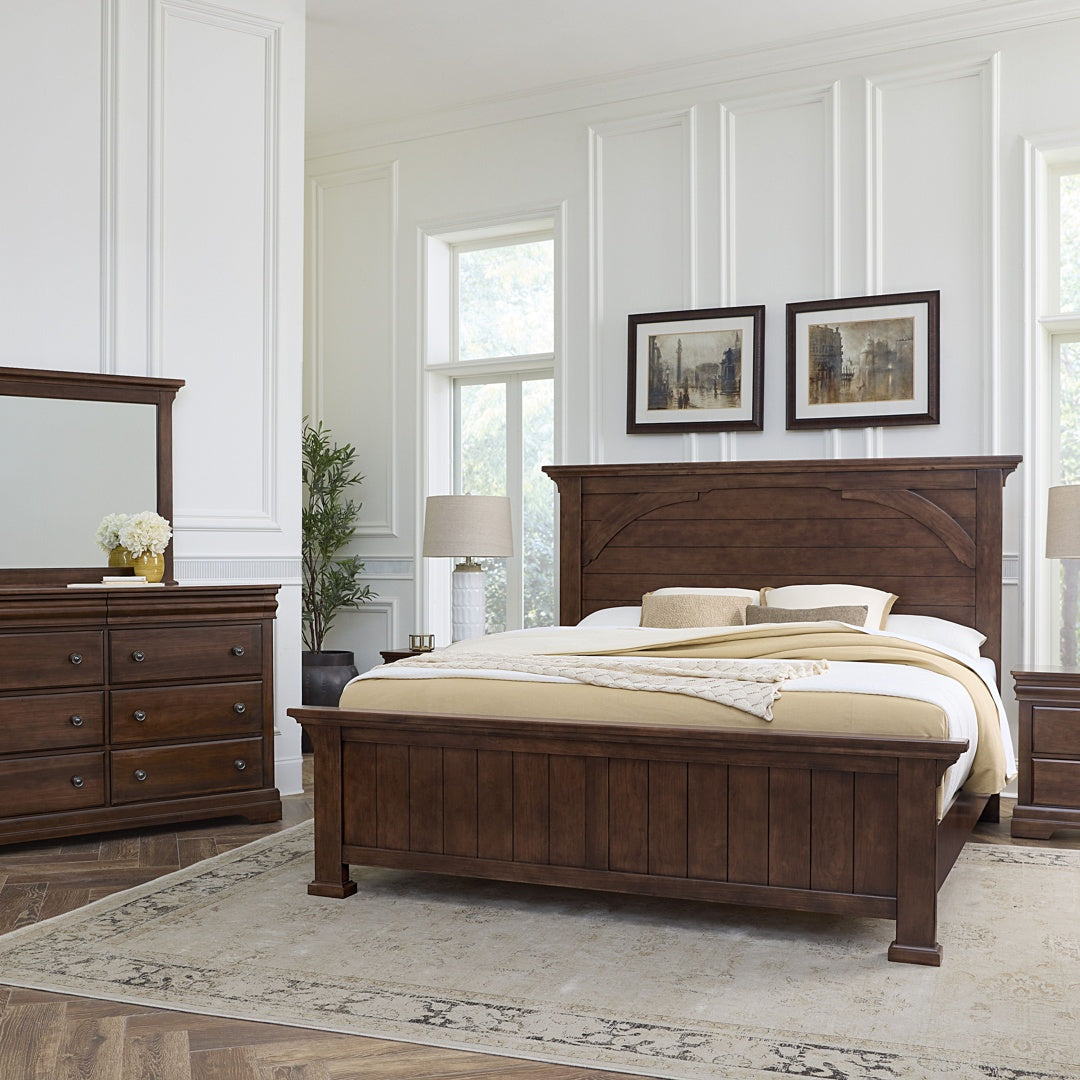 MADE IN USA - Galax, VA - Vista: A classic design with timeless elements. Crafted from Solid Poplar and Cherry Veneer, this Louis Phillipe inspired suite features a felt-lined drawer hidden behind the shaped moulding at the top of the dresser and chest. The storage pieces feature burnished brass drawer pulls and dual ball bearing, self-closing drawer guides. There are two classic beds, Mansion and Sleigh, both with an option for footboard storage. Through an innovative program with the Virginia Department of Forestry; Vaughan Bassett replaces every tree needed to produce their furniture. Over two million have been planted over the last 15 or so years.