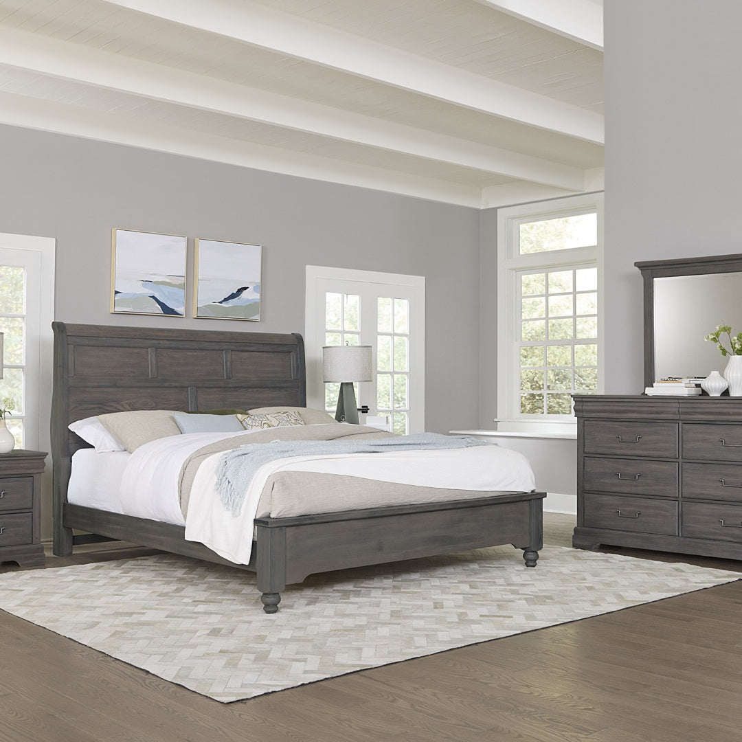MADE IN USA - Galax, VA - Vista: A classic design with timeless elements. Crafted from Solid Poplar and Oak Veneer, this Louis Phillipe inspired suite features a felt-lined drawer hidden behind the shaped moulding at the top of the dresser and chest. The storage pieces feature antiqued pewter drawer pulls with dual ball bearing, self-closing drawer guides. There are two classic beds, Mansion and Sleigh, both with an option for footboard storage. Through an innovative program with the Virginia Department of Forestry; Vaughan Bassett replaces every tree needed to produce their furniture. Over two million have been planted over the last 15 or so years.