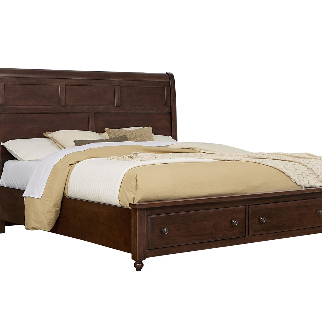 MADE IN USA - Galax, VA - Vista: A classic design with timeless elements. Crafted from Solid Poplar and Cherry Veneer, this Louis Phillipe inspired suite features a felt-lined drawer hidden behind the shaped moulding at the top of the dresser and chest. The storage pieces feature burnished brass drawer pulls and dual ball bearing, self-closing drawer guides. There are two classic beds, Mansion and Sleigh, both with an option for footboard storage. Through an innovative program with the Virginia Department of Forestry; Vaughan Bassett replaces every tree needed to produce their furniture. Over two million have been planted over the last 15 or so years.