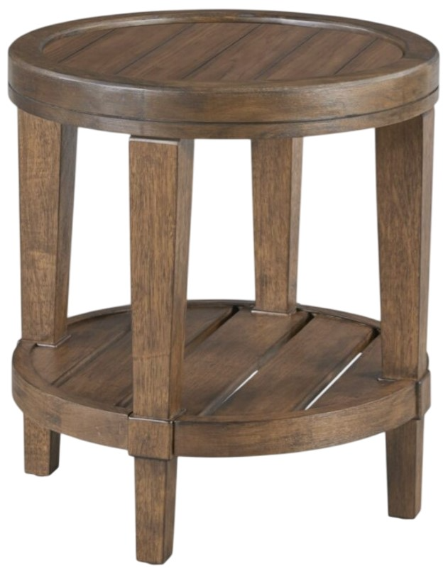 The England Furniture Oliver brown round end table is crafted of sepia solids and white oak veneers, showcasing a refined brown finish. Its round design and tapered legs present an elegant profile, while the lower open shelf adds versatile display or storage space. A stylish and functional accent for any living area.Read More