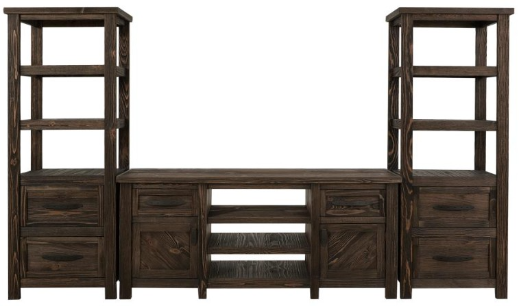 The warm brown stain highlights the inherent beauty of the wood, enhancing its rustic charm and enduring appeal. This thoughtfully designed unit seamlessly blends style and practicality. The piers have three drawers and three fixed shelves, providing ample space for display and storage. Meanwhile, the central TV stand features two drawers, two doors, and three fixed shelves, ensuring functional elegance for your entertainment setup. Together, these pieces form a cohesive and captivating wall unit that marries practicality with timeless design, creating a centerpiece that transforms any room into a welcoming retreat.