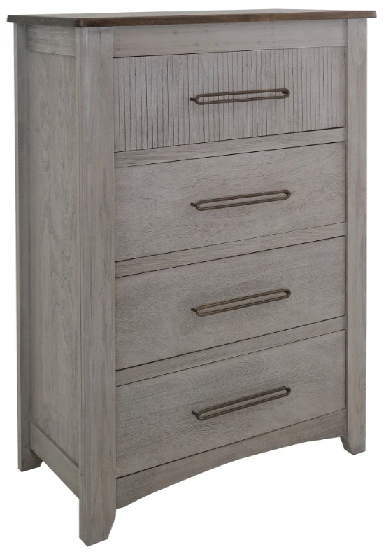The Ridge chest features four spacious drawers, offering plenty of storage for all your bedroom essentials. It features sleek metal handles that enhance its modern aesthetic. Made from Melina and poplar wood, this collection guarantees durability and timeless appeal. The elegant light gray finish and brown tops blend seamlessly with any décor style.Read More