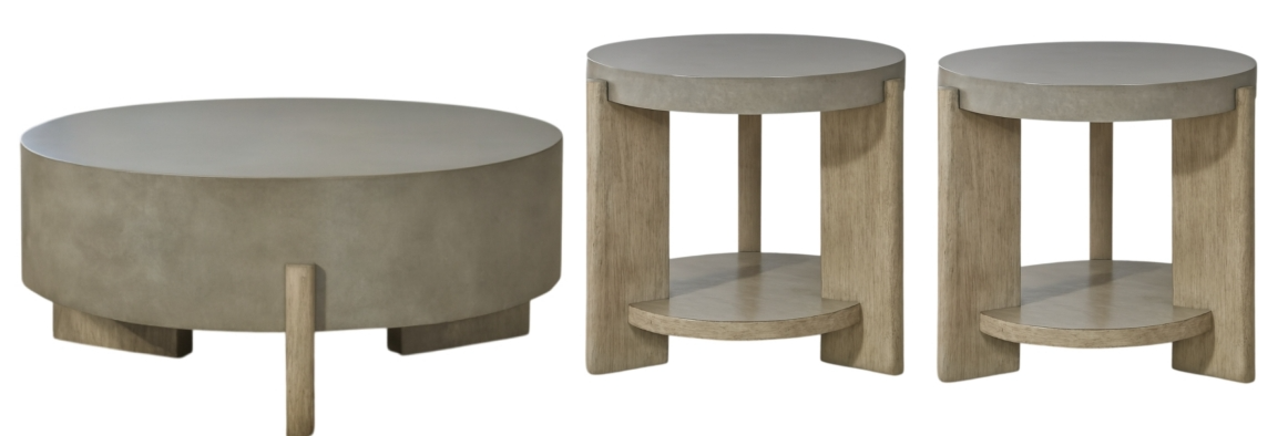 Feel at home with the Affinity three piece set which includes the round cocktail table and two round end tables. Crafted with excellence using Rubberwood solids and Quartered White Oak veneers, this set features faux concrete tops and rounded oblong legs in a Dusty Taupe finish.Read More