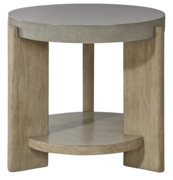 Feel at home with the Affinity round end table. Crafted with excellence using Rubberwood solids and Quartered White Oak veneers, this table features a faux concrete top and rounded oblong legs in a Dusty Taupe finish. The bottom shelf is great for additional storage.Read More