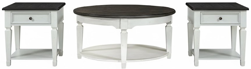 Allyson Park brings farmhouse to the next level refined yet casual. Features heavy wire brushing, one full extension drawer in each end table, planked top, bead molding accents, and a bottom shelf for additional storage, cocktail is castered to make rearranging a breeze, square turned tapered legs, and antique pewter knob hardware.Read More