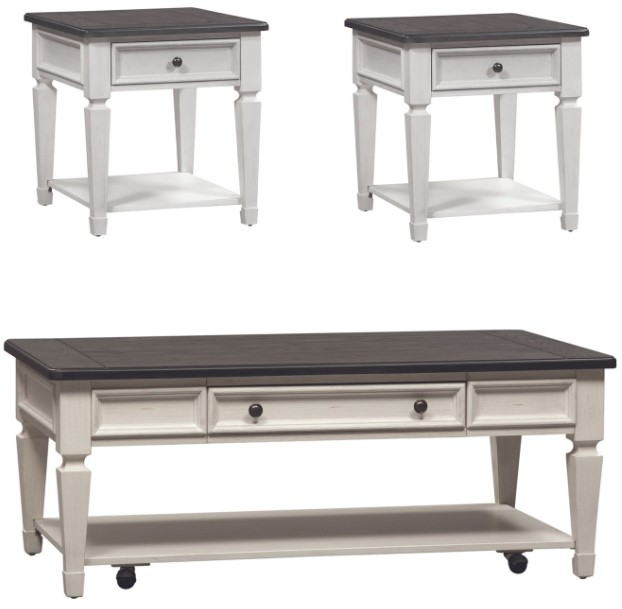Features heavy wire brushing, one full extension drawer in each table, planked top, bead molding accents, and a bottom shelf for additional storage, cocktail is castered to make rearranging a breeze, square turned tapered legs, and antique pewter knob hardware. This group is perfect for creating a classic look while maintaining a casual feel. Kit consists of one rectangle cocktail table and two rectangle end tables. Also offered in a black forest and emery grey top.