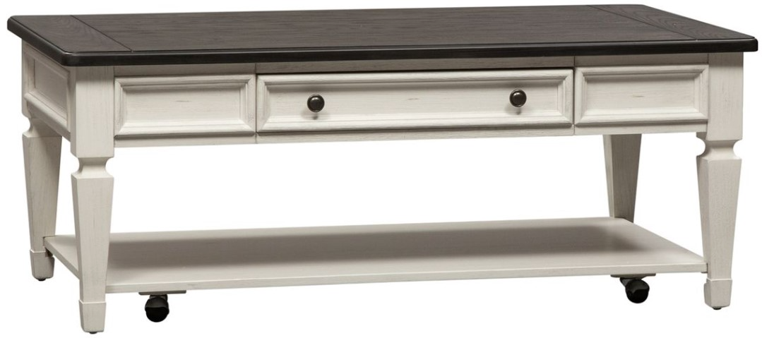 Accent your living space with the Allyson Park rectangular cocktail table. Crafted of pine, rubberwood, and poplar solids with cathedral white oak tops and pine veneers, this piece features a wire brushed white finish with a charcoal top, full extension drawer glides for easy access to storage.Read More