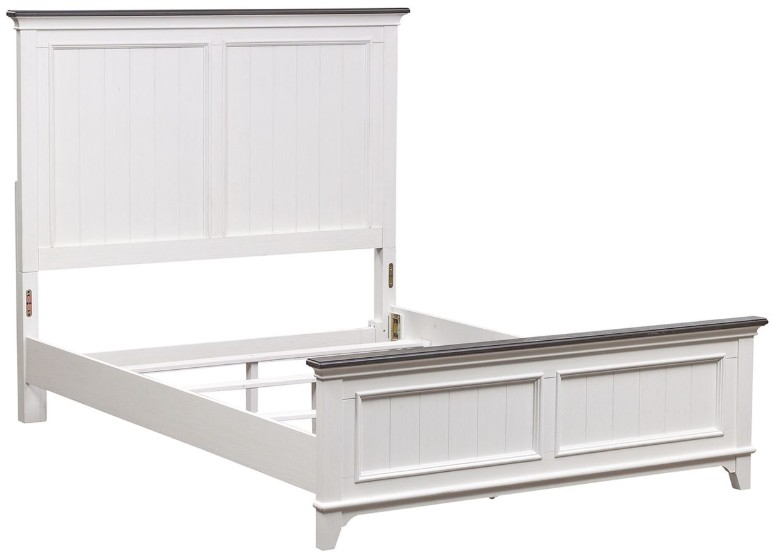 Create a classic look with a casual feel using the Allyson Park panel bed. Crafted of pine solids, pine veneers, and cathedral white oak tops, this piece features a center slat support system, bolt on rails, planked panels, bead molding, charcoal grey cap rails, and is anchored by tapered block feet.Read More