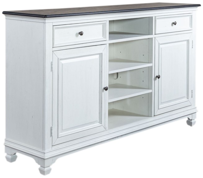 Indulge in a classic look and casual feel with the Allyson Park 68" tv console. Crafted with poplar solids with cathedral white oak veneer top, this piece accommodates most 72" TVs and features a wire brushed white finish with charcoal planked tops.Read More