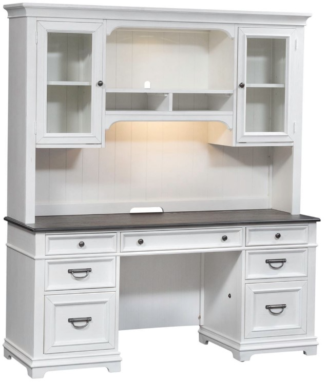 Create a classic look with a casual feel with the Allyson Park credenza and hutch. Crafted with pine solids with cathedral white oak tops and pine veneer fronts, this piece features bottom case dust proofing, a wire brushed white finish with planked charcoal tops, a flip-down keyboard tray, and an open design concept.Read More