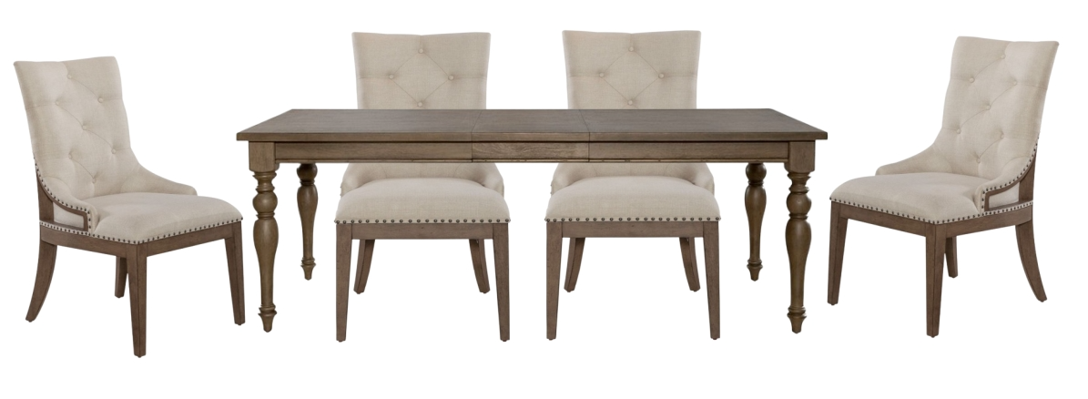 Be distinctively different with the Americana Farmhouse five-piece leg table set. Crafted of poplar and rubberwood solids with white oak veneers, this kit features a wire-brushed dusty taupe finish with wormhole distressing and consists of a leg table and four upholstered shelter side chairs.Read More