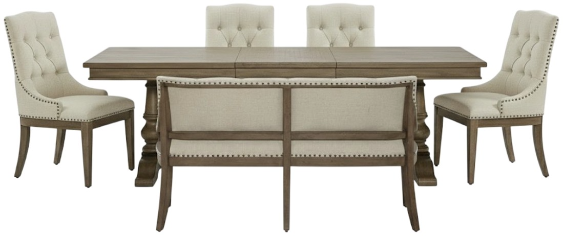Be distinctively different with the Americana Farmhouse six-piece trestle table set. Crafted of poplar and rubberwood solids with white oak veneers, this kit features a wire brushed dusty taupe finish with worm hole distressing and consists of the trestle table, four upholstered shelter side chairs, and the upholstered shelter dining bench.Read More