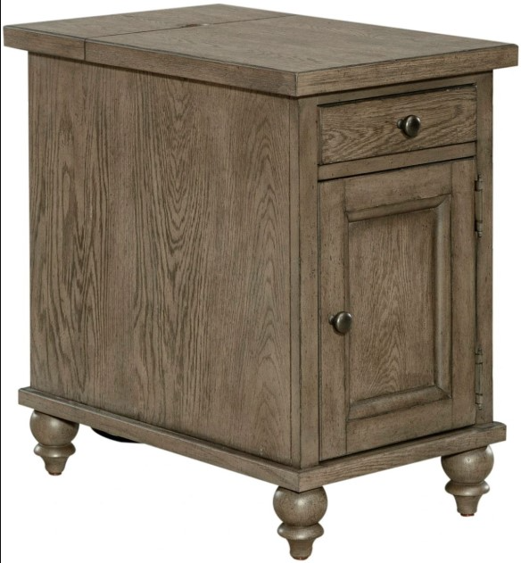 Scaled for just the right spot, America Farmhouse chairside table can be used between two recliners or a nightstand in the bedroom. Crafted of poplar solids and white oak veneers with a dusty taupe finish. Features one full extension drawer, a door for space to stash essentials and turned bun feet.Read More