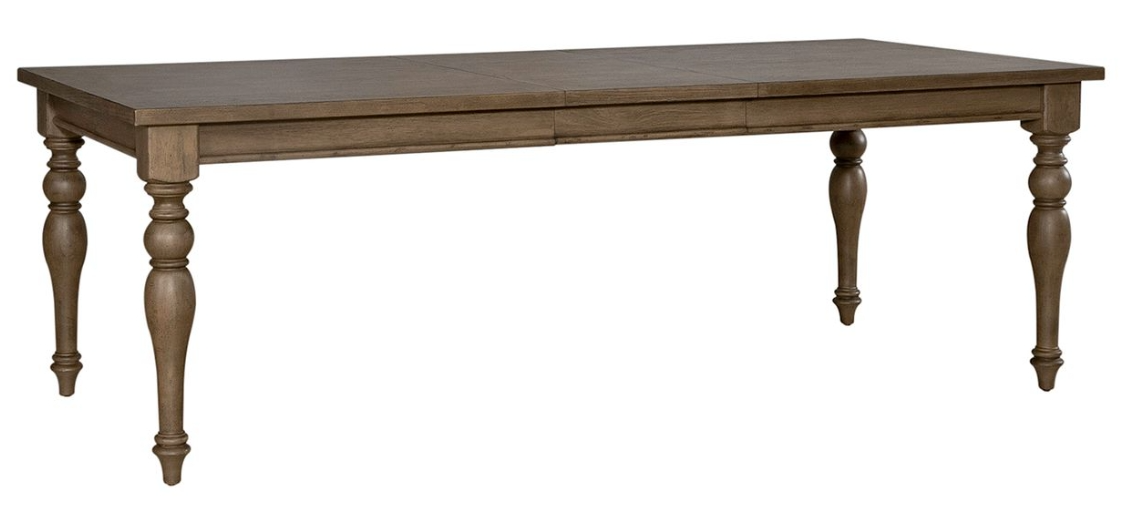 Crafted of poplar solids and white oak veneers, the Americana Farmhouse rectangular leg table features a wire brushed dusty taupe finish with wormhole distressing. This leg table has heavy turned legs and bead molding on the apron.Read More