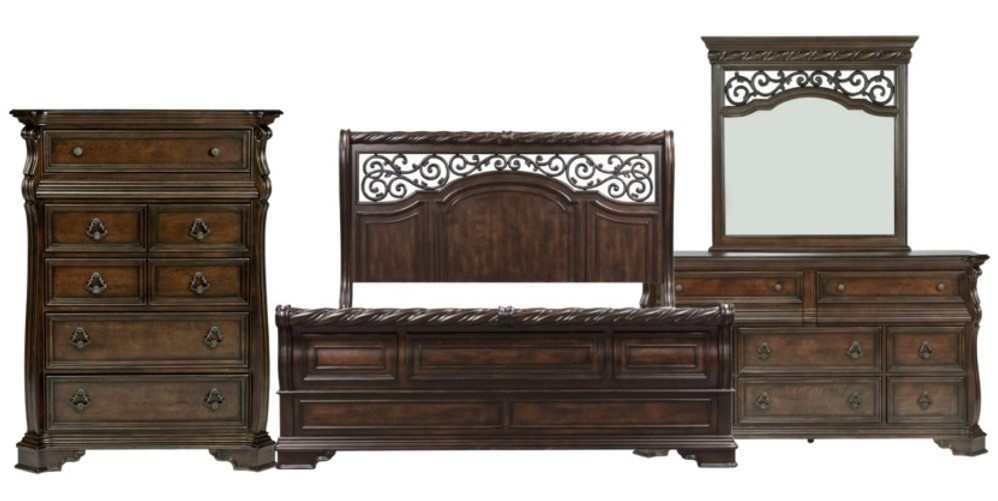 A hidden drawer, full extension drawers with felt lined top drawers, scrolled bracket feet, and is accented with a custom designed drop ring and knob hardware. This sleigh bed features rope twist cap rails on the headboard and footboard. The headboard also has scrolled inserts finished in a burnished brass metal. The dresser has eight drawers, including the two hidden drawers. The landscape mirror features a beveled edge and has scrolled metal inserts to match the headboard and can be attached to the dresser using the included bolt-on supports. The chest offers six drawers of storage, with two drawers having bluff-cut drawer fronts giving the illusion of multiple smaller drawers, while still offering deep storage. Arbor Place bridges a combination of bold and dramatic scaling with soft shapes creating a casual, traditional style.