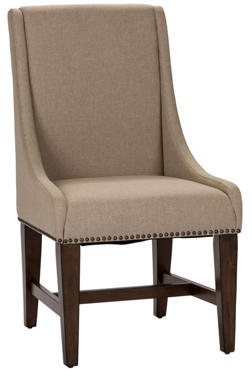 Sit in comfort and style with the Armand upholstered side chair. Crafted rubberwood solids, this piece features an antique brownstone finish, brass nail head trim along the bottom of the seat, linen upholstery for added style and comfort, an armless design, nylon chair glides to protect your flooring, and is anchored by tapered wood legs.Read More