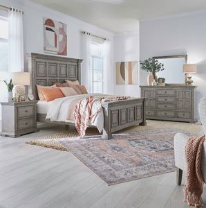 Featuring dovetail-crafted drawers, antique pewter knobs, felt-lined top drawers, and dust-proof cases, this 4-piece california king bedroom package includes a dresser with mirror, chest, and panel bed. It showcases graduated bead molding, full-extension side drawer guides, and a cohesive Graystone finish across all storage elements.Read More
