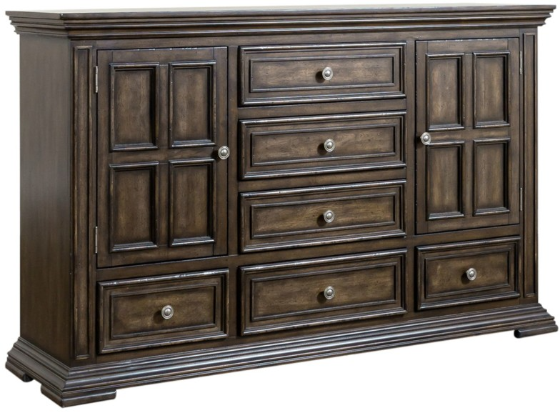 Make a statement with this large scale 2 door 6 drawer dresser. The brownstone finish is accented by heavy artistic distressing and antique pewter hardware. Expand storage space in your room with 4 large drawers, 2 small drawers and by having the ability to remove the adjustable shelf located behind each door.Read More