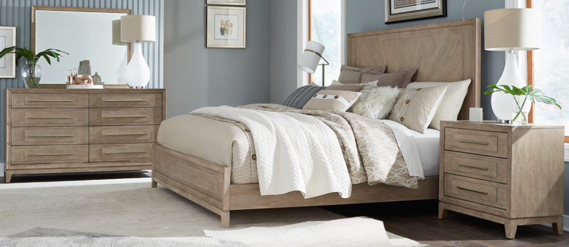 Transform your bedroom into a haven of sophistication with the Brentwood queen panel bed, dresser, mirror, and nightstand. Crafted with meticulous attention to detail using Rubberwood solids and Split Heart White Oak veneers, this set features a Sandstone finishRead More
