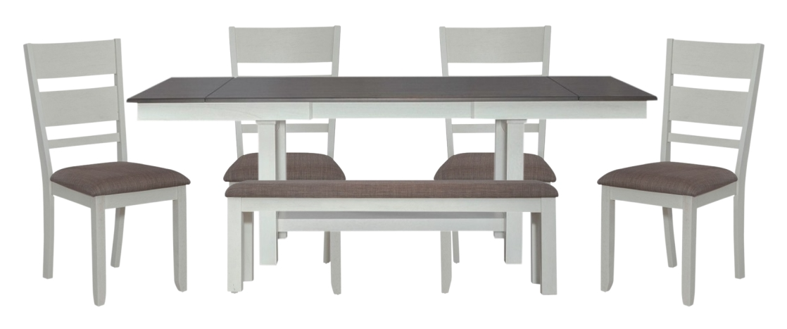 Feel at home with the Brook Bay optional six-piece trestle table set. Crafted with excellence using rubberwood solids and mindy veneers, this set features a two-tone Carbon Gray and Textured White finish and consists of the trestle table, four upholstered slat back side chairs, and the upholstered dining bench.Read More