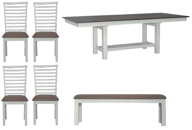 Feel at home with the Brook Bay six-piece trestle table set. Crafted with excellence using rubberwood solids and mindy veneers, this set features a two-tone Carbon Gray and Textured White finish and consists of the trestle table, four upholstered ladder back side chairs, and the upholstered dining bench.Read More