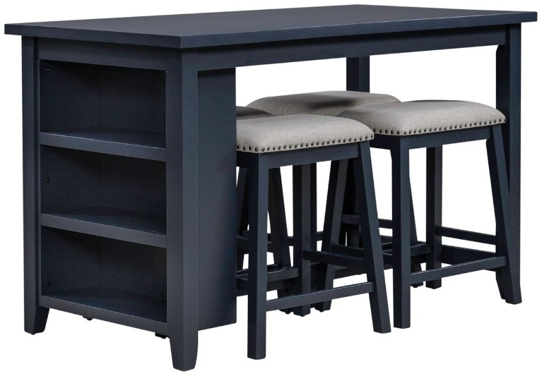 The Brook Creek 5-piece counter dining set blends charm and function beautifully. The table features a square-edge top, sturdy square legs, and a practical bookshelf end for added storage. The upholstered stools offer comfort with tapered legs and antique brass nail head accents, creating a stylish, inviting dining space.Read More