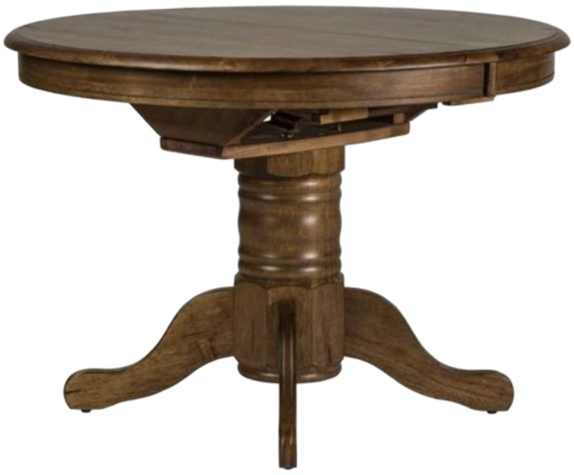 This Carolina Crossing pedestal table is distressed, yet current. Consisting of an antique honey finish with heavy distressing, this table design translates well into any space. This is a smaller pedestal table, making it perfect for limited space, but could also be used in a larger space, as there is a 15" butterfly leaf included.Read More