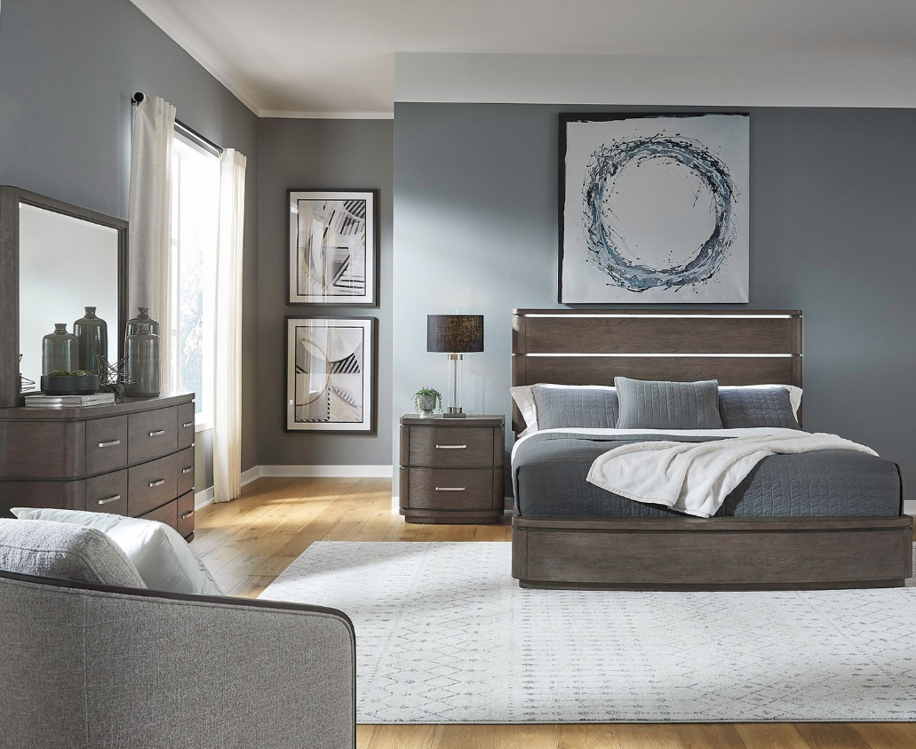 Elevate your bedroom décor to new heights of sophistication and comfort with the cascade falls queen panel bed, dresser, mirror, and nightstand. Crafted with excellence using rubberwood solids and split heart white oak veneers, this set features a satin espresso finish.Read More