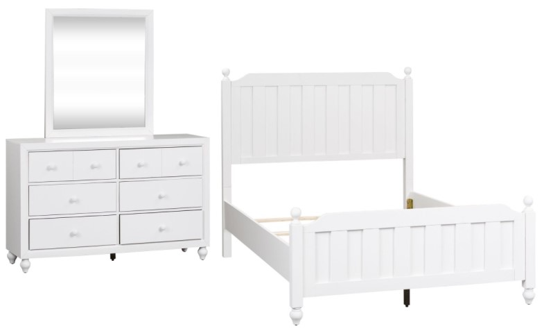 Design possibilities are endless with the Cottage View full panel bed, dresser, and mirror. Crafted of melamine and rubberwood solids, this kit features a white finish, picture frame solid wood case molding, bluff-cut top drawers, bun feet, and is accented with wooden knob hardware.Read More
