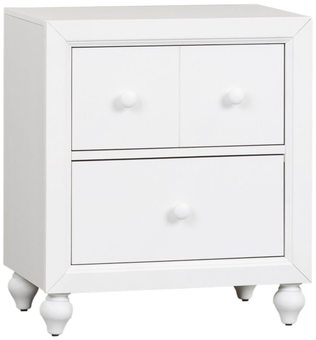 Indulge in cottage design with the Cottage View nightstand. Crafted of melamine and a rubberwood solid frame, this piece features a clean white finish, kenlin drawer glides, laminate drawer interior, bluff cut top drawers, bun feet, bottom case dust proofing, solid wood picture frame moldings, accented by wooden knob hardware.Read More