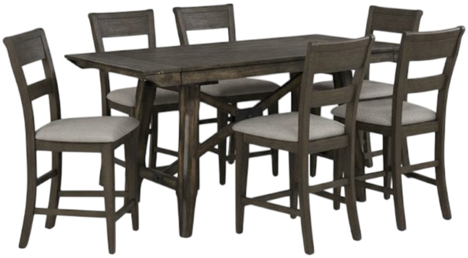 Gather the family around the Double Bridge 7-piece gathering table set, consisting of a gathering table and six slat back counter chairs. Crafted of rubberwood solids and acacia veneers, this kit features a dark chestnut finish with wire brushing.Read More