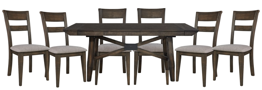 Gather the family around the Double Bridge 7-piece trestle table set, consisting of a trestle table, and six slat back side chairs. Crafted of rubberwood solids and acacia veneers, this kit features a dark chestnut finish with wire brushing.Read More