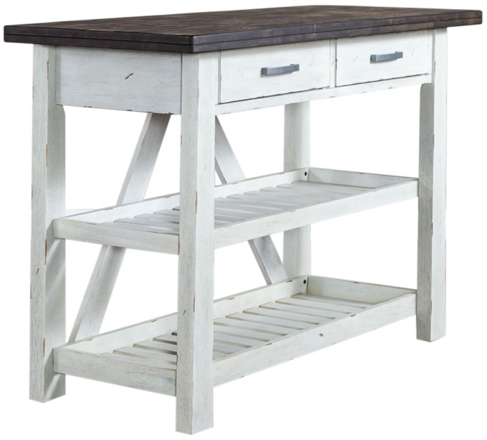 Indulge in style while enjoying an abundance of storage with the Farmhouse server. This piece features a timeless heavy distressing, diagonal slats at the back to accentuate the farmhouse look, wood drawer glides, a solid wood top, two storage drawers fully stained with felt lining, and shelving for additional storage, accented by pewter pull hardware.Read More