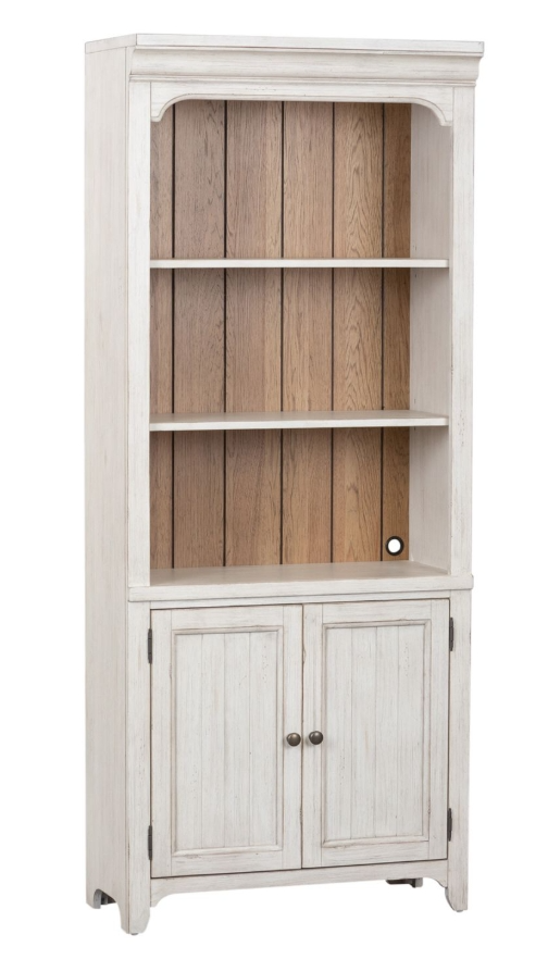 Create a classic look with a casual feel using the Farmhouse Reimagined 78" bookcase. Crafted with pine solids with hickory and pine veneers, this piece features heavy distressing, wire management access, and a planked back panel in the chestnut finish, accented by antique brass knob hardware.Read More